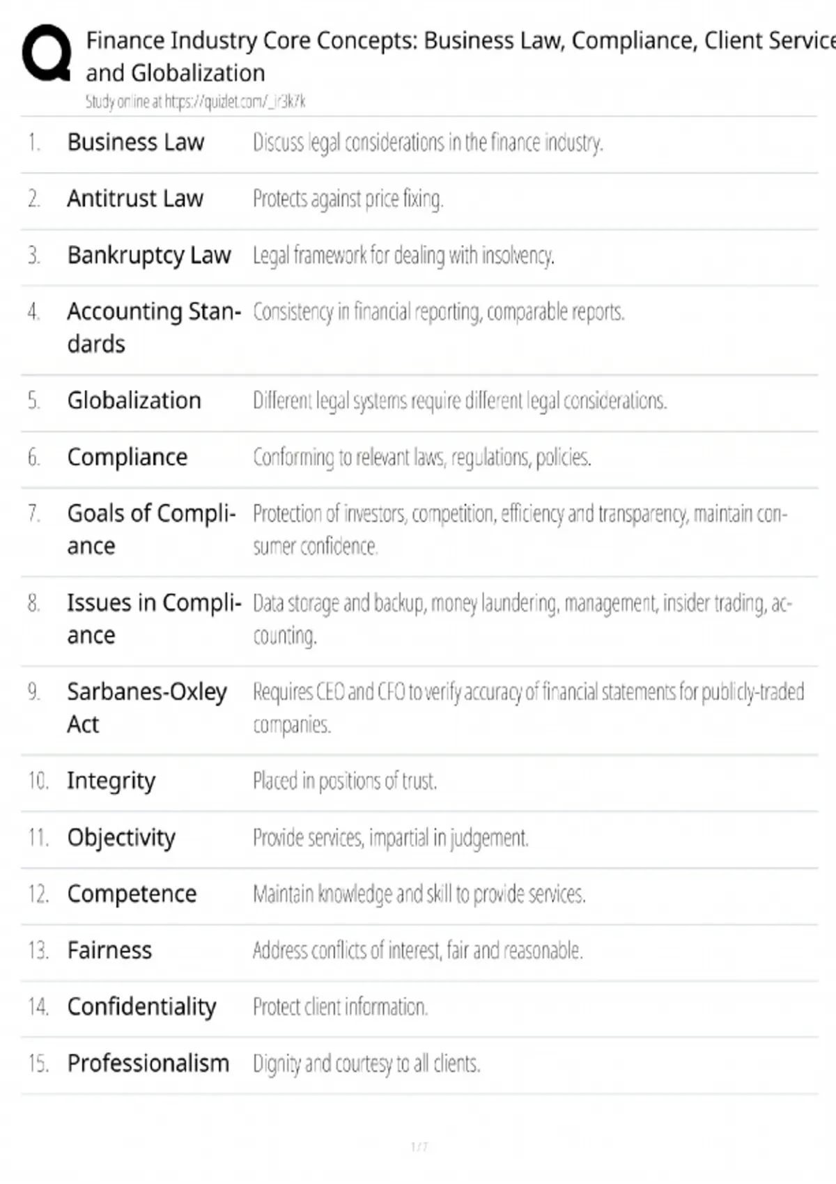 Master the core concepts of the modern Finance Industry for your FINRA, CFA, or business degree with this comprehensive 2025 study guide. This resource covers essential pillars: Business Law & Regulations, Compliance & Ethics, Client Service & Suitability, and the impact of Globalization on financial markets. It includes key regulations, case studies, practice test questions, and study notes to ensure you are prepared to score 100% on professional exams and course assessments.