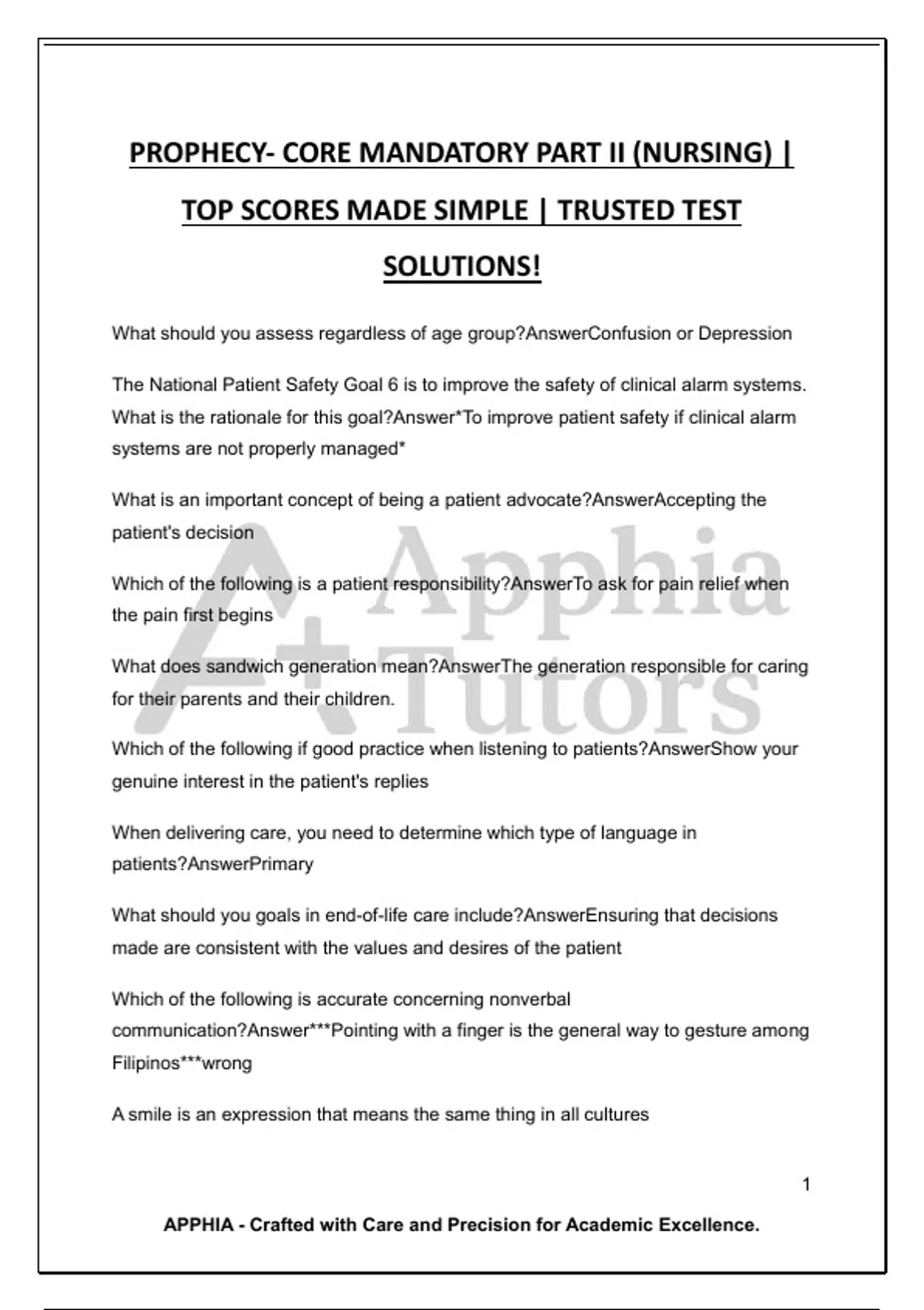 PROPHECY- CORE MANDATORY PART II (NURSING) | TOP SCORES MADE SIMPLE | TRUSTED TEST SOLUTIONS!