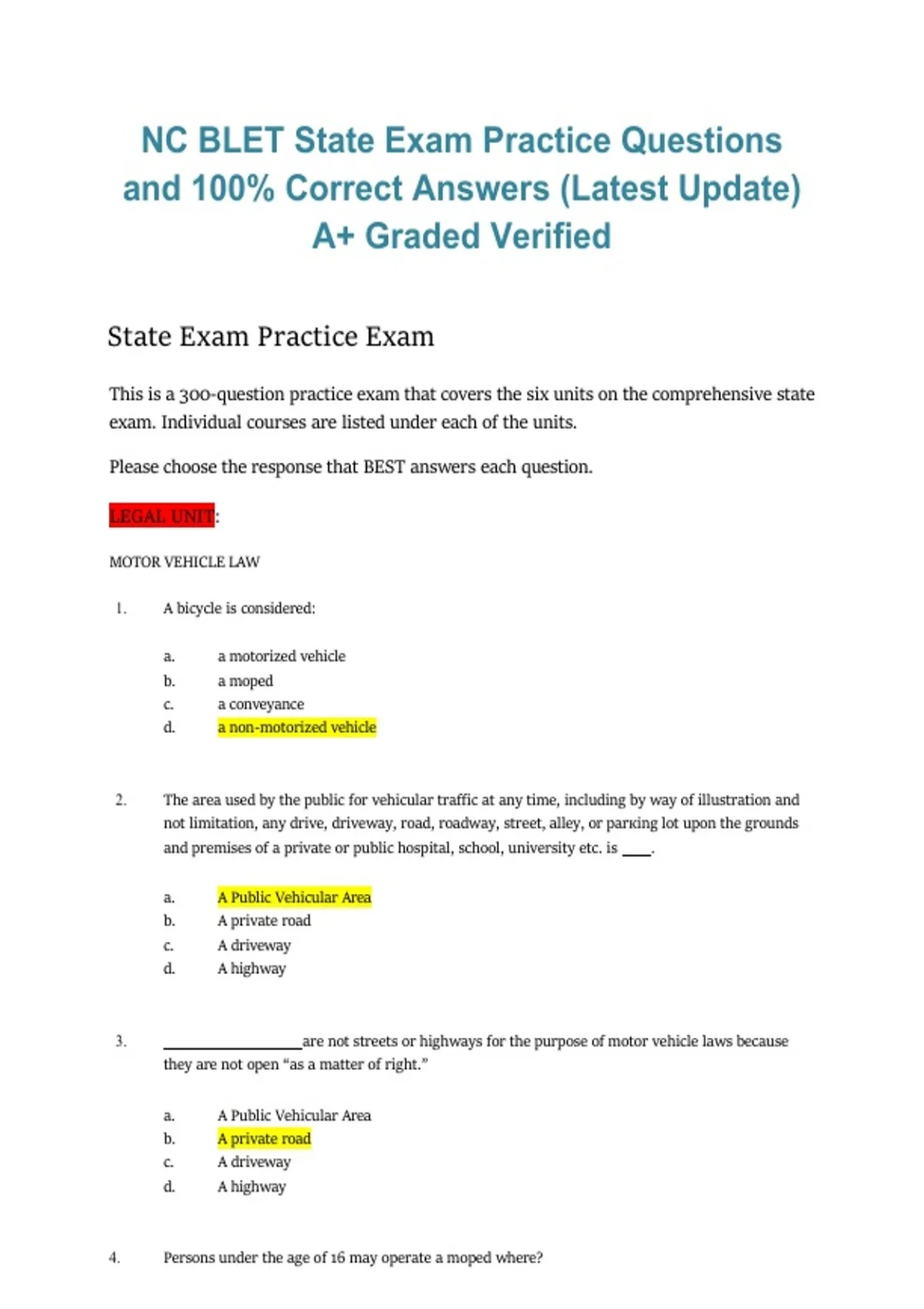 This document includes updated NC BLET State Exam practice questions with verified correct answers for the 2026/2027 testing cycle. It covers essential BLET topics such as criminal and traffic law, arrest and search procedures, patrol operations, use of force, and officer safety to support reliable and exam-focused preparation.