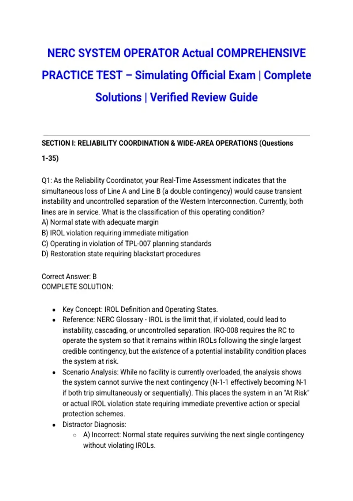 Q1: As the Reliability Coordinator, your Real-Time Assessment indicates that the