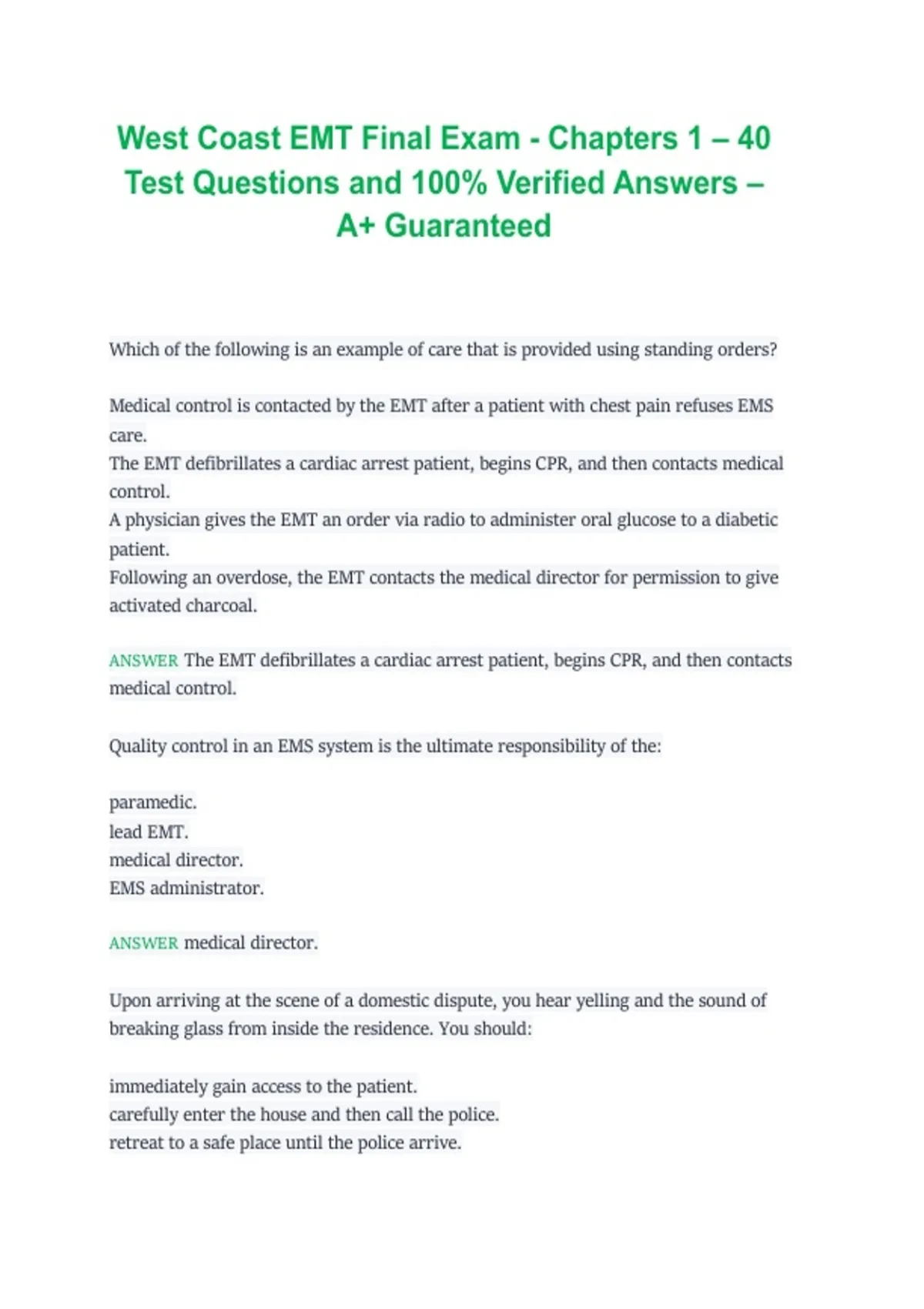 West Coast EMT Final Exam – Chapters 1–40 Test Questions with 100% Verified Answers, 2026/2027 A+ Guaranteed Exam Preparation