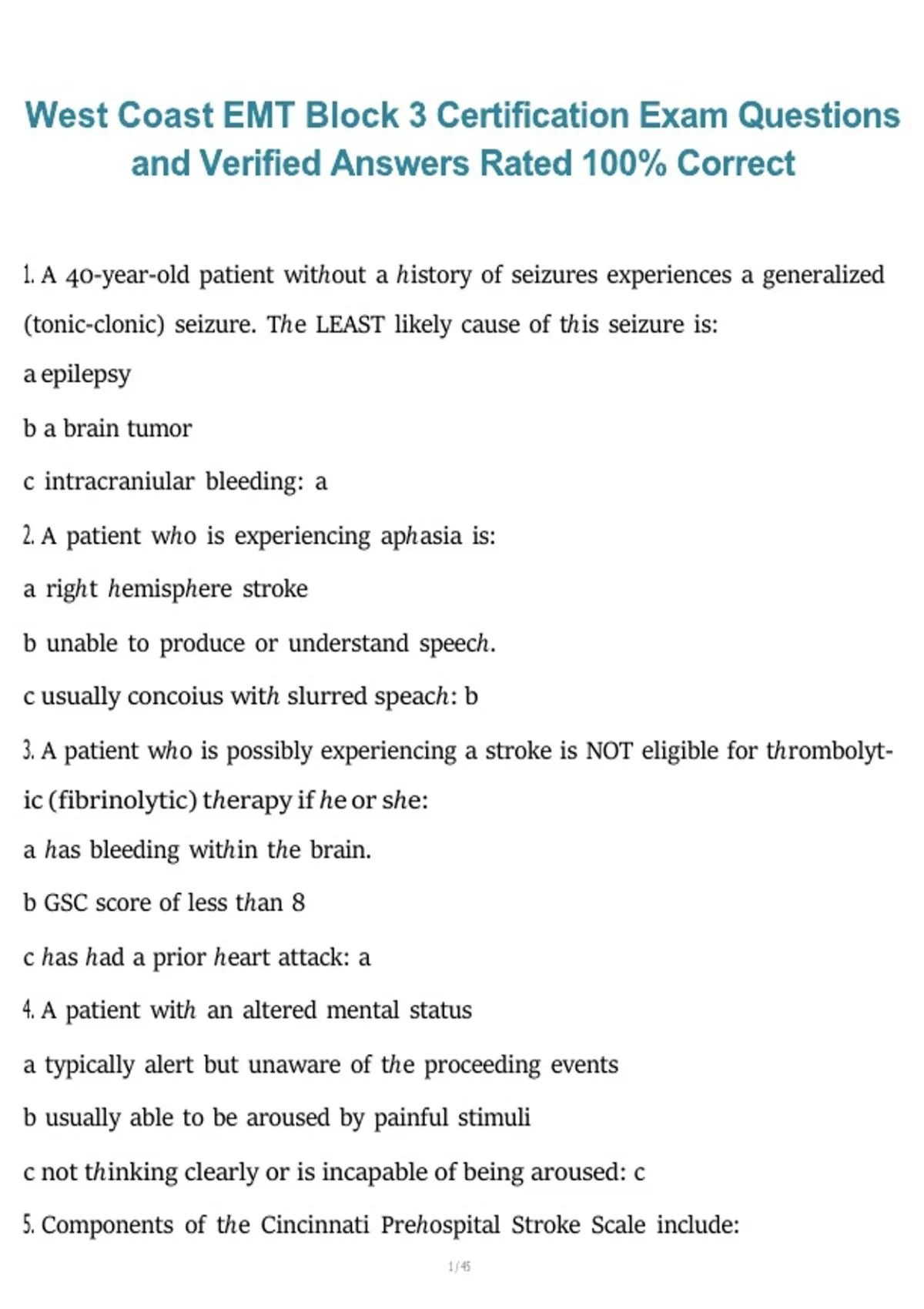 This document includes practice questions and verified correct answers for the West Coast EMT Block 3 Certification Exam. It covers key EMS topics such as patient assessment, airway management, trauma care, medical emergencies, pharmacology, and EMS operational procedures, providing reliable and thorough preparation for certification.