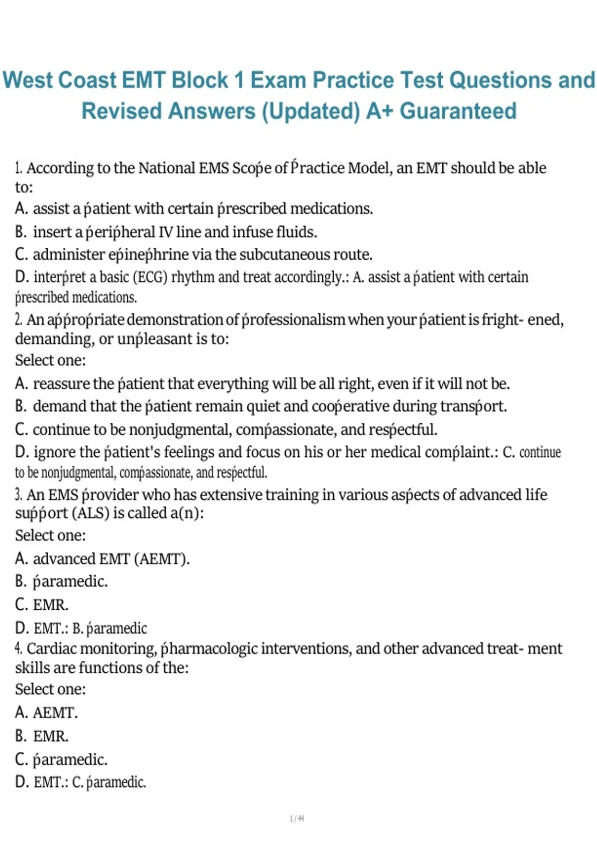 This document provides practice test questions and revised, verified answers for the West Coast EMT Block 1 Exam. It covers core EMS topics including patient assessment, airway management, trauma and medical emergencies, pharmacology, and EMS operational procedures, ensuring thorough and exam-focused preparation for 2026/2027.