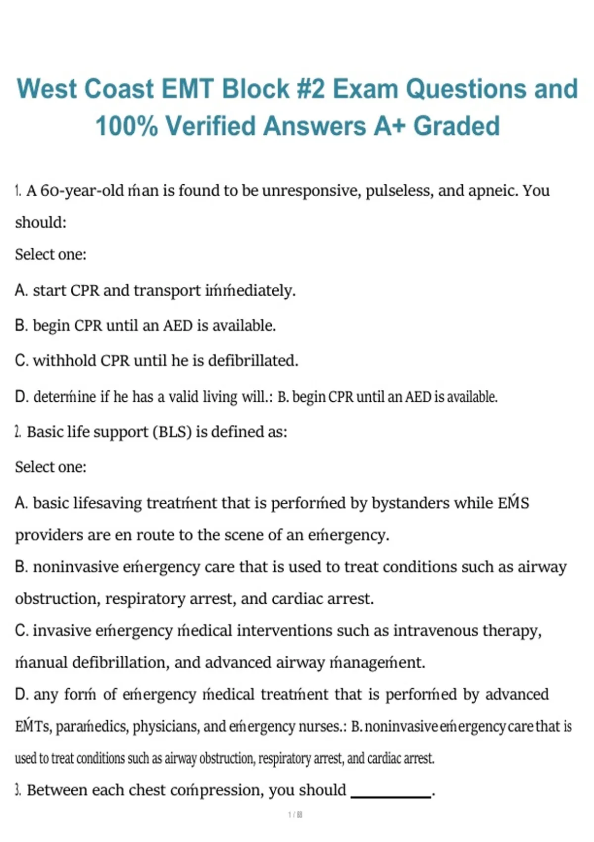 This document contains West Coast EMT Block #2 Exam practice questions with 100% verified correct answers for the 2026/2027 exam cycle. It covers essential EMS topics including patient assessment, airway management, trauma care, medical emergencies, pharmacology, and operational procedures, providing reliable and comprehensive preparation.