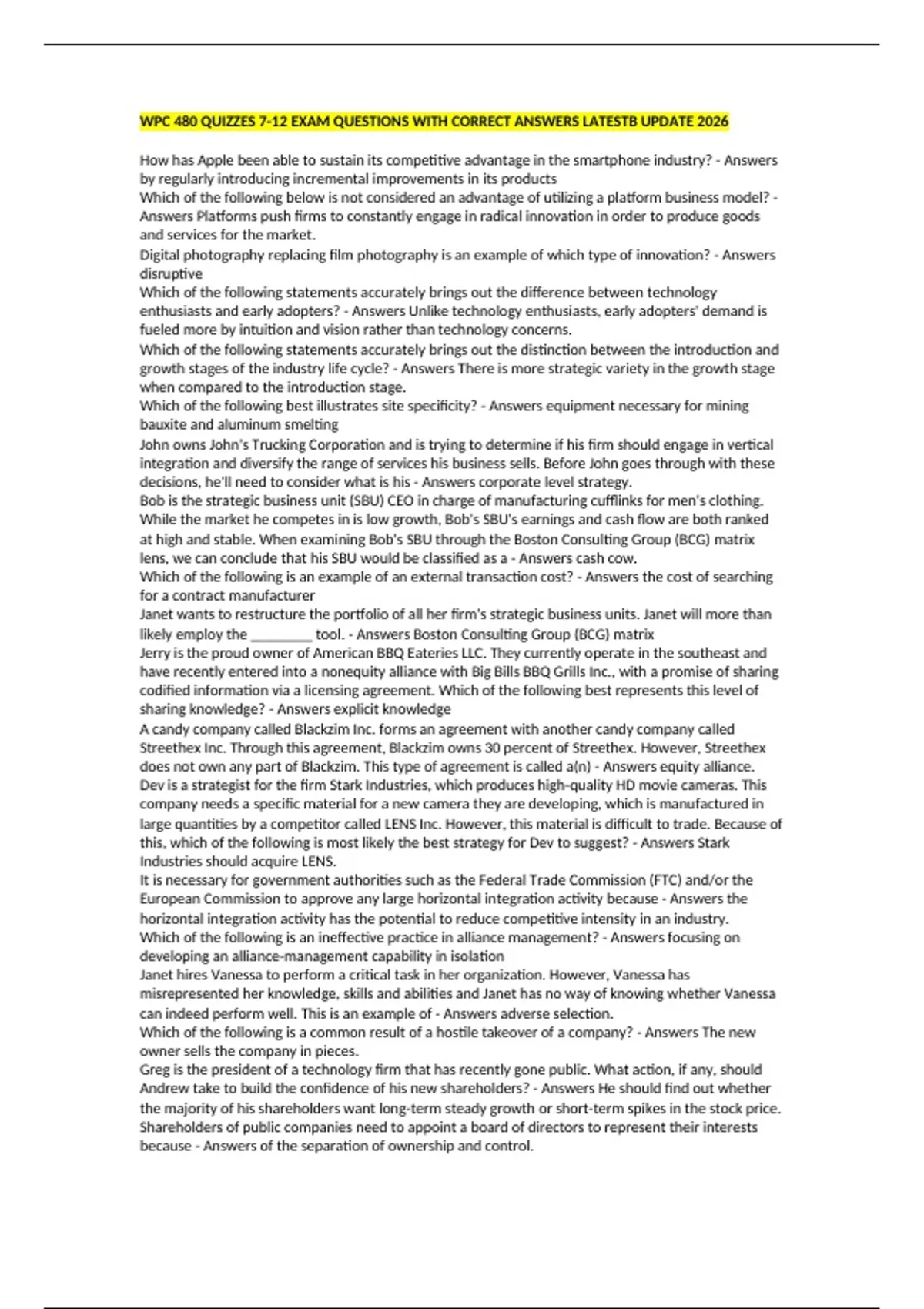 WPC 480 QUIZZES 7-12 EXAM QUESTIONS WITH CORRECT ANSWERS LATESTB UPDATE 2026 How has Apple been able to sustain its competitive advantage in the smartphone industry? - Answers by regularly introducing incremental improvements in its products Which of the following below is not considered an advantage of utilizing a platform business model? - Answers Platforms push firms to constantly engage in radical innovation in order to produce goods and services for the market. Digital photography replacing film photography is an example of which type of innovation? - Answers disruptive Which of the following statements accurately brings out the difference between technology enthusiasts and early adopters? - Answers Unlike technology enthusiasts, early adopters' demand is fueled more by intuition and vision rather than technology concerns. Which of the following statements accurately brings out the distinction between the introduction and growth stages of the industry life cycle? - Answers There is more strategic variety in the growth stage when compared to the introduction stage. Which of the following best illustrates site specificity? - Answers equipment necessary for mining bauxite and aluminum smelting John owns John's Trucking Corporation and is trying to determine if his firm should engage in vertical integration and diversify the range of services his business sells. Before John goes through with these decisions, he'll need to consider what is his - Answers corporate level strategy. Bob is the strategic business unit (SBU) CEO in charge of manufacturing cufflinks for men's clothing. While the market he competes in is low growth, Bob's SBU's earnings and cash flow are both ranked at high and stable. When examining Bob's SBU through the Boston Consulting Group (BCG) matrix lens, we can conclude that his SBU would be classified as a - Answers cash cow. Which of the following is an example of an external transaction cost? - Answers the cost of searching for a contract manufacturer Janet wants to restructure the portfolio of all her firm's strategic business units. Janet will more than likely employ the ________ tool. - Answers Boston Consulting Group (BCG) matrix Jerry is the proud owner of American BBQ Eateries LLC. They currently operate in the southeast and have recently entered into a nonequity alliance with Big Bills BBQ Grills Inc., with a promise of sharing codified information via a licensing agreement. Which of the following best represents this level of sharing knowledge? - Answers explicit knowledge A candy company called Blackzim Inc. forms an agreement with another candy company called Streethex Inc. Through this agreement, Blackzim owns 30 percent of Streethex. However, Streethex does not own any part of Blackzim. This type of agreement is called a(n) - Answers equity alliance. Dev is a strategist for the firm Stark Industries, which produces high-quality HD movie cameras. This company needs a specific material for a new camera they are developing, which is manufactured in large quantities by a competitor called LENS Inc. However, this material is difficult to trade. Because of this, which of the following is most likely the best strategy for Dev to suggest? - Answers Stark Industries should acquire LENS. It is necessary for government authorities such as the Federal Trade Commission (FTC) and/or the European Commission to approve any large horizontal integration activity because - Answers the horizontal integration activity has the potential to reduce competitive intensity in an industry. Which of the following is an ineffective practice in alliance management? - Answers focusing on developing an alliance-management capability in isolation Janet hires Vanessa to perform a critical task in her organization. However, Vanessa has misrepresented her knowledge, skills and abilities and Janet has no way of knowing whether Vanessa can indeed perform well. This is an example of - Answers adverse selection. Which of the following is a common result of a hostile takeover of a company? - Answers The new owner sells the company in pieces. Greg is the president of a technology firm that has recently gone public. What action, if any, should Andrew take to build the confidence of his new shareholders? - Answers He should find out whether the majority of his shareholders want long-term steady growth or short-term spikes in the stock price. Shareholders of public companies need to appoint a board of directors to represent their interests because - Answers of the separation of ownership and control.