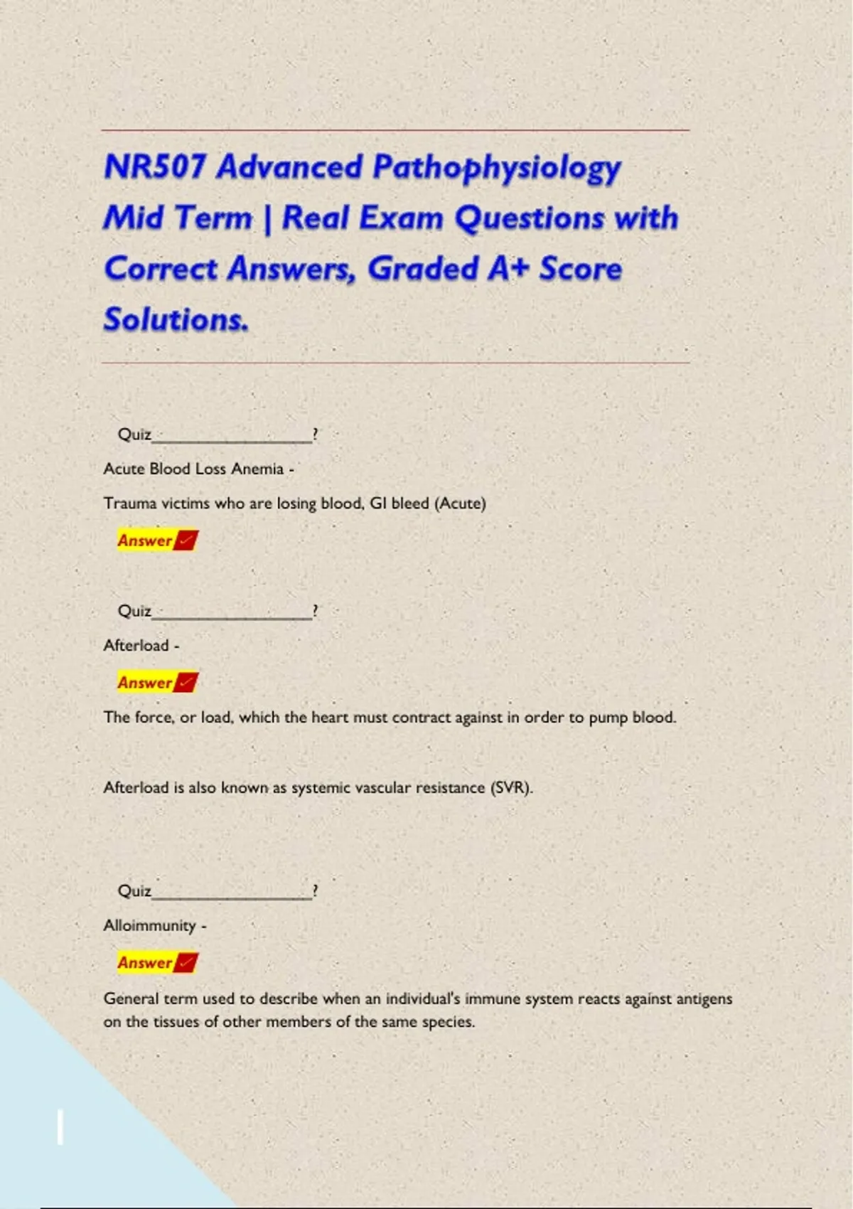NR507 Advanced Pathophysiology Mid Term | Real Exam Questions with Correct Answers, Graded A+ Score Solutions. Quiz_________________? Acute Blood Loss Anemia - Trauma victims who are losing blood, GI bleed (Acute) Answer Quiz_________________? Afterload - Answer The force, or load, which the heart must contract against in order to pump blood. Afterload is also known as systemic vascular resistance (SVR). Quiz_________________? Alloimmunity - Answer General term used to describe when an individual's immune system reacts against antigens on the tissues of other members of the same species. Examples: Neonatal disease where the maternal immune system becomes sensitized against antigens expressed by the fetus, Transplant rejection, Transfusion reaction Quiz_________________? Aortic Regurgitation - Answer Blood is coming back from the Aorta into the L. Ventricle through the Aortic Valve Causes Widening or aneurysmal change of the aortic annulus (ring of fibrous tissue surrounding the aorta) Endocarditis Rheumatic Fever Signs & Symptoms Fatigue Syncope SOB Palpitations Widened Pulse Pressure L. Ventricular Dilation Early diastolic murmur along left sternal border **Shortness of breath that progressively worsens High pitched early diastolic murmur heard loudest at left lower sternal border Diastolic rumbling sound at the heart's apex Systolic crescendo-decrescendo murmur heard at the left upper sternal border A chest x-ray may show signs of pulmonary edema and cardiomegaly** Quiz_________________? Aortic Stenosis - Answer Blood backed up into left ventricle causing perfusion problems for the rest of the body Causes: Bicuspid aortic valve- congenital condition (only two cusps to the aortic valve which usually has three cusps)- the two cusps get damaged quicker because they are doing the work of three Age related calcification- obstruction/ stenosis Smoking, High BP, Hypertension, Hyperlipid, Diabetes Rheumatic Fever Signs & Symptoms = SAD S: Syncope A: Angina D: Dyspnea **Fainting Chest pressure upon exercising Sustained, laterally displaced apical pulse Mid-systolic crescendo-decrescendo murmur heard loudest at base and radiating to the neck S4 gallop present** Quiz_________________? Aplastic Anemia - Answer Diagnosis made by blood tests and bone marrow biopsy. AA is suspected if levels of circulating erythrocytes, leukocytes and platelets diminished: -Granulocyte count less than 500/ uL -Platelet count less than 20,000/ uL -Absolute reticulocyte count less than or equal to 40 x 109/ L Quiz_________________? Asthma - Answer Airways constricted Intrinsic: triggered by something internal such as anxiety Extrinsic: triggered by something in outside environment- something in the air (dust mites/pet dander) In mildest form of asthma (intermittent), short acting beta2-agonist inhalers are prescribed Mild-persistent asthma will have night symptoms 3-4 days a month Quiz_________________? Autoimmunity - Answer Autoimmune disease can be familial, Affected family members may not all develop the same disease, but several members may have different disorders characterized by a variety of hypersensitivity reactions, These include autoimmune and allergic reactions Associations with particular autoimmune diseases have been identified for a variety of major histocompatibility complex (MHC) alleles or non-MHC genes Quiz_________________? Cardiac Output (CO) - Answer The amount of blood that the heart pumps in 1 minute. CO is also known as cardiac contractility. CO=heart rate (HR) x stroke volume (SV).