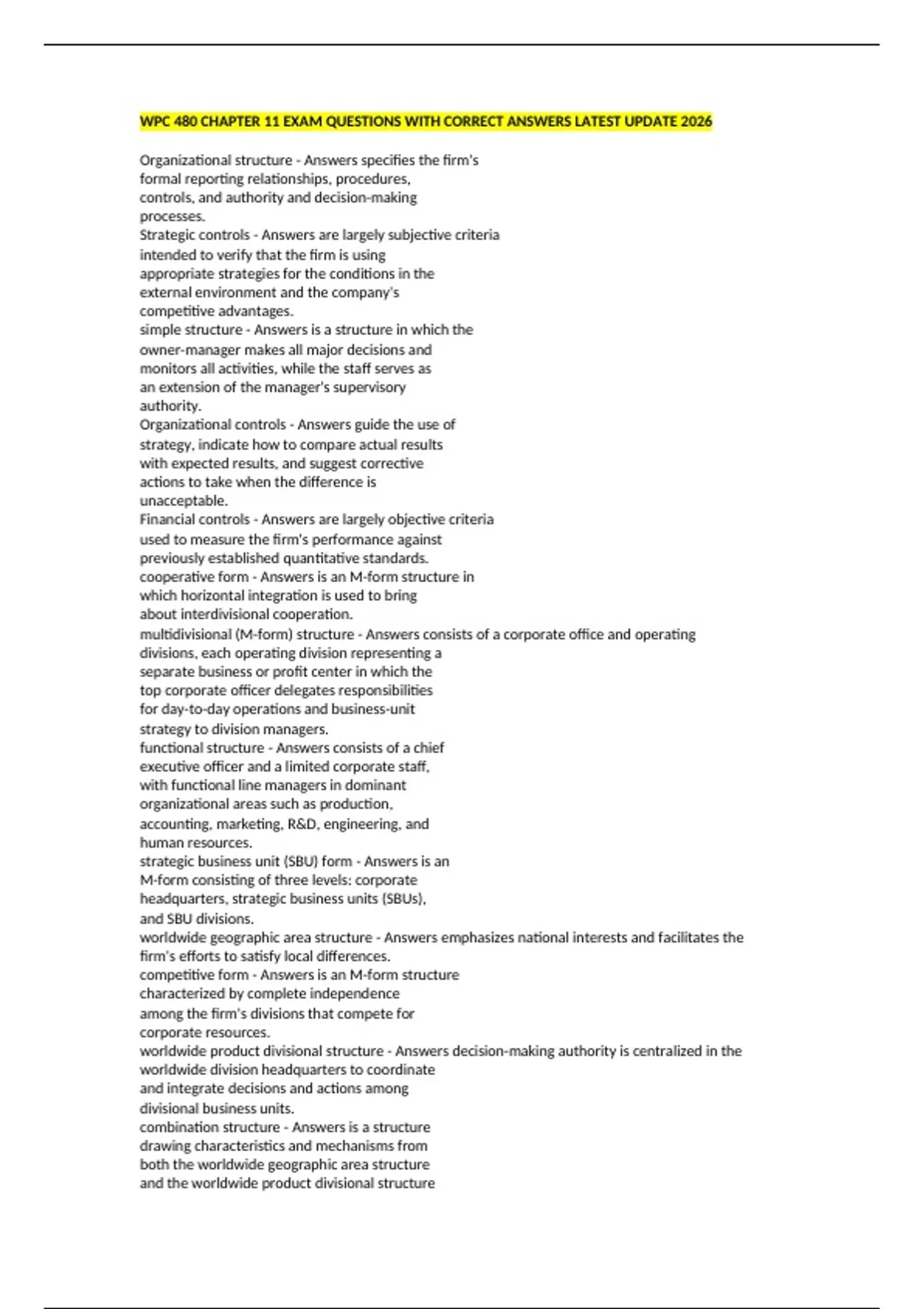 WPC 480 CHAPTER 11 EXAM QUESTIONS WITH CORRECT ANSWERS LATEST UPDATE 2026 Organizational structure - Answers specifies the firm's formal reporting relationships, procedures, controls, and authority and decision-making processes. Strategic controls - Answers are largely subjective criteria intended to verify that the firm is using appropriate strategies for the conditions in the external environment and the company's competitive advantages. simple structure - Answers is a structure in which the owner-manager makes all major decisions and monitors all activities, while the staff serves as an extension of the manager's supervisory authority. Organizational controls - Answers guide the use of strategy, indicate how to compare actual results with expected results, and suggest corrective actions to take when the difference is unacceptable. Financial controls - Answers are largely objective criteria used to measure the firm's performance against previously established quantitative standards. cooperative form - Answers is an M-form structure in which horizontal integration is used to bring about interdivisional cooperation. multidivisional (M-form) structure - Answers consists of a corporate office and operating divisions, each operating division representing a separate business or profit center in which the top corporate officer delegates responsibilities for day-to-day operations and business-unit strategy to division managers. functional structure - Answers consists of a chief executive officer and a limited corporate staff, with functional line managers in dominant organizational areas such as production, accounting, marketing, R&D, engineering, and human resources. strategic business unit (SBU) form - Answers is an M-form consisting of three levels: corporate headquarters, strategic business units (SBUs), and SBU divisions. worldwide geographic area structure - Answers emphasizes national interests and facilitates the firm's efforts to satisfy local differences. competitive form - Answers is an M-form structure characterized by complete independence among the firm's divisions that compete for corporate resources. worldwide product divisional structure - Answers decision-making authority is centralized in the worldwide division headquarters to coordinate and integrate decisions and actions among divisional business units. combination structure - Answers is a structure drawing characteristics and mechanisms from both the worldwide geographic area structure and the worldwide product divisional structure