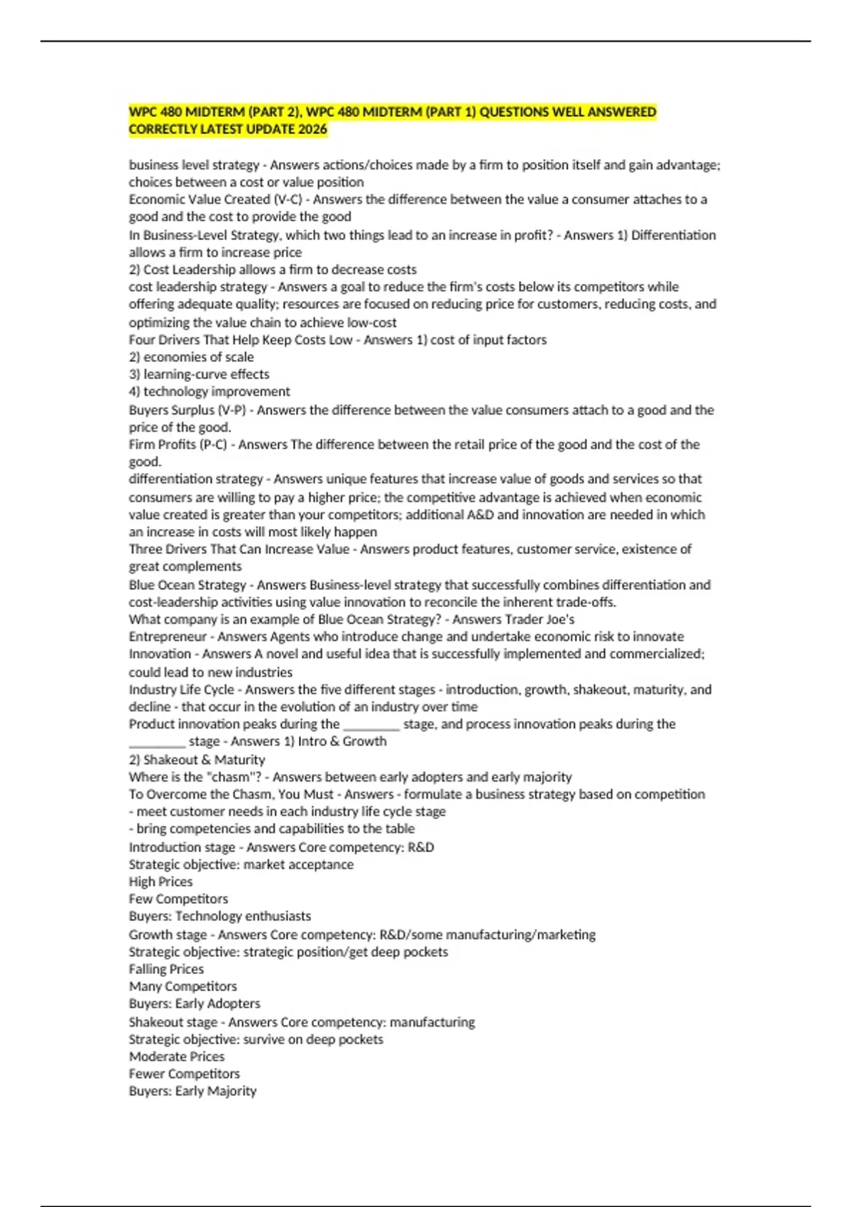 WPC 480 MIDTERM (PART 2), WPC 480 MIDTERM (PART 1) QUESTIONS WELL ANSWERED CORRECTLY LATEST UPDATE 2026 business level strategy - Answers actions/choices made by a firm to position itself and gain advantage; choices between a cost or value position Economic Value Created (V-C) - Answers the difference between the value a consumer attaches to a good and the cost to provide the good In Business-Level Strategy, which two things lead to an increase in profit? - Answers 1) Differentiation allows a firm to increase price 2) Cost Leadership allows a firm to decrease costs cost leadership strategy - Answers a goal to reduce the firm's costs below its competitors while offering adequate quality; resources are focused on reducing price for customers, reducing costs, and optimizing the value chain to achieve low-cost Four Drivers That Help Keep Costs Low - Answers 1) cost of input factors 2) economies of scale 3) learning-curve effects 4) technology improvement Buyers Surplus (V-P) - Answers the difference between the value consumers attach to a good and the price of the good. Firm Profits (P-C) - Answers The difference between the retail price of the good and the cost of the good. differentiation strategy - Answers unique features that increase value of goods and services so that consumers are willing to pay a higher price; the competitive advantage is achieved when economic value created is greater than your competitors; additional A&D and innovation are needed in which an increase in costs will most likely happen Three Drivers That Can Increase Value - Answers product features, customer service, existence of great complements Blue Ocean Strategy - Answers Business-level strategy that successfully combines differentiation and cost-leadership activities using value innovation to reconcile the inherent trade-offs. What company is an example of Blue Ocean Strategy? - Answers Trader Joe's Entrepreneur - Answers Agents who introduce change and undertake economic risk to innovate Innovation - Answers A novel and useful idea that is successfully implemented and commercialized; could lead to new industries Industry Life Cycle - Answers the five different stages - introduction, growth, shakeout, maturity, and decline - that occur in the evolution of an industry over time Product innovation peaks during the ________ stage, and process innovation peaks during the ________ stage - Answers 1) Intro & Growth 2) Shakeout & Maturity Where is the "chasm"? - Answers between early adopters and early majority To Overcome the Chasm, You Must - Answers - formulate a business strategy based on competition - meet customer needs in each industry life cycle stage - bring competencies and capabilities to the table Introduction stage - Answers Core competency: R&D Strategic objective: market acceptance High Prices Few Competitors Buyers: Technology enthusiasts Growth stage - Answers Core competency: R&D/some manufacturing/marketing Strategic objective: strategic position/get deep pockets Falling Prices Many Competitors Buyers: Early Adopters Shakeout stage - Answers Core competency: manufacturing Strategic objective: survive on deep pockets Moderate Prices Fewer Competitors Buyers: Early Majority Maturity stage - Answers Core competency: manufacturing, process engineering, marketing Strategic objective: maintain strong strategic position