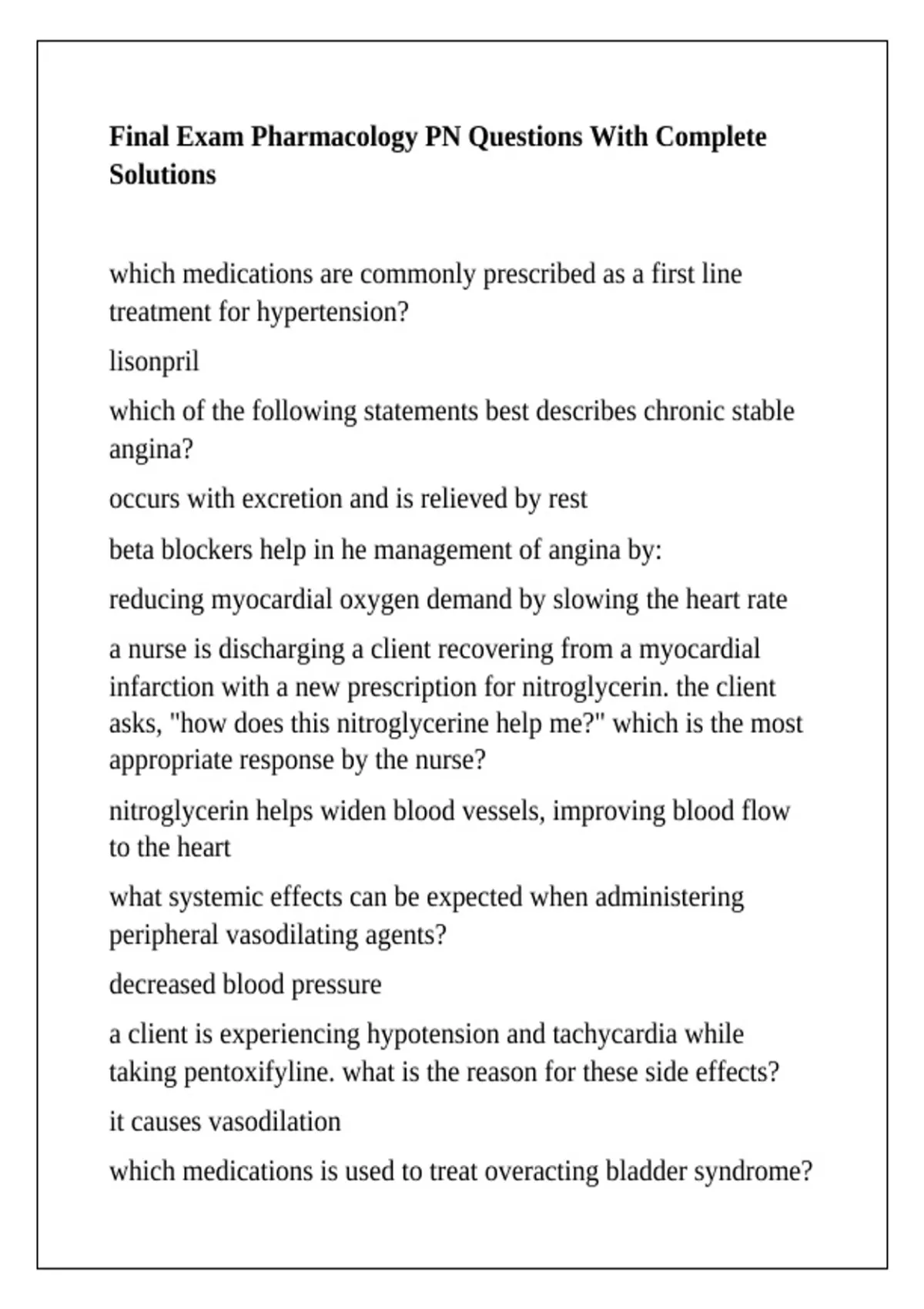 Final Exam Pharmacology PN Questions With Complete Solutions