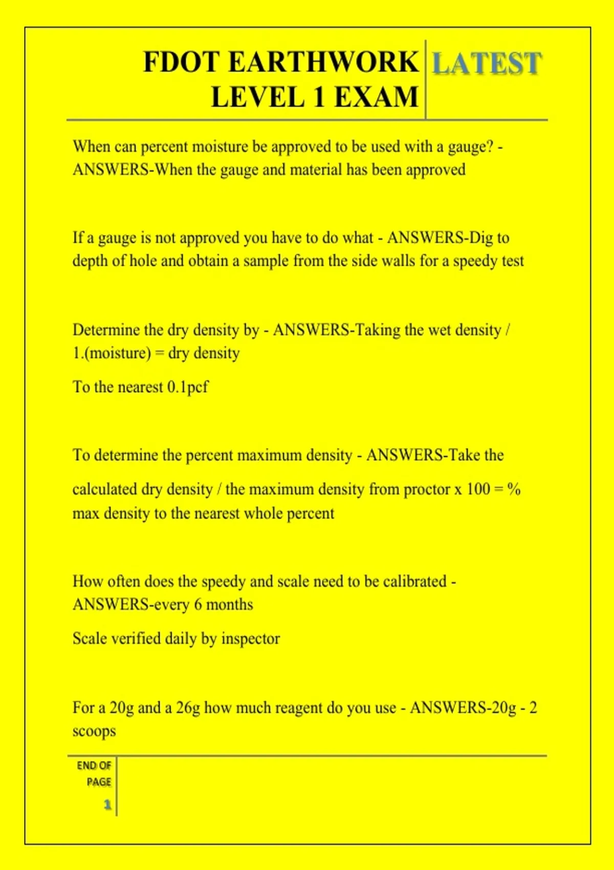 FDOT EARTHWORK LEVEL 1 EXAM QUESTIONS AND ANSWERS 2026