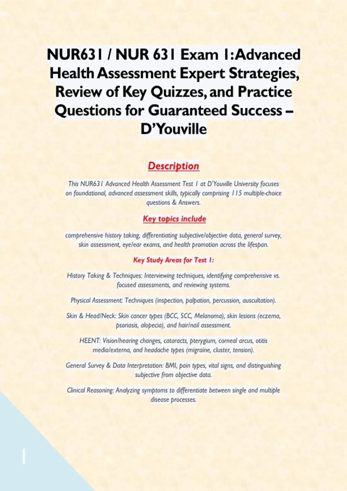 NUR631 / NUR 631 Exam 1: Advanced Health Assessment Expert Strategies, Review of Key Quizzes, and Practice Questions for Guaranteed Success – D’Youville Description This NUR631 Advanced Health Assessment Test 1 at D'Youville University focuses on foundational, advanced assessment skills, typically comprising 115 multiple-choice questions & Answers. Key topics include comprehensive history taking, differentiating subjective/objective data, general survey, skin assessment, eye/ear exams, and health promotion across the lifespan. Key Study Areas for Test 1: History Taking & Techniques: Interviewing techniques, identifying comprehensive vs. focused assessments, and reviewing systems. Physical Assessment: Techniques (inspection, palpation, percussion, auscultation). Skin & Head/Neck: Skin cancer types (BCC, SCC, Melanoma), skin lesions (eczema, psoriasis, alopecia), and hair/nail assessment. HEENT: Vision/hearing changes, cataracts, pterygium, corneal arcus, otitis media/externa, and headache types (migraine, cluster, tension). General Survey & Data Interpretation: BMI, pain types, vital signs, and distinguishing subjective from objective data. Clinical Reasoning: Analyzing symptoms to differentiate between single and multiple disease processes.