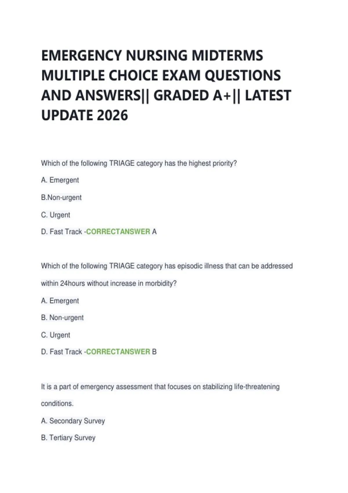 EMERGENCY NURSING MIDTERMS MULTIPLE CHOICE EXAM QUESTIONS AND ANSWERS|| GRADED A+|| LATEST UPDATE 2026
