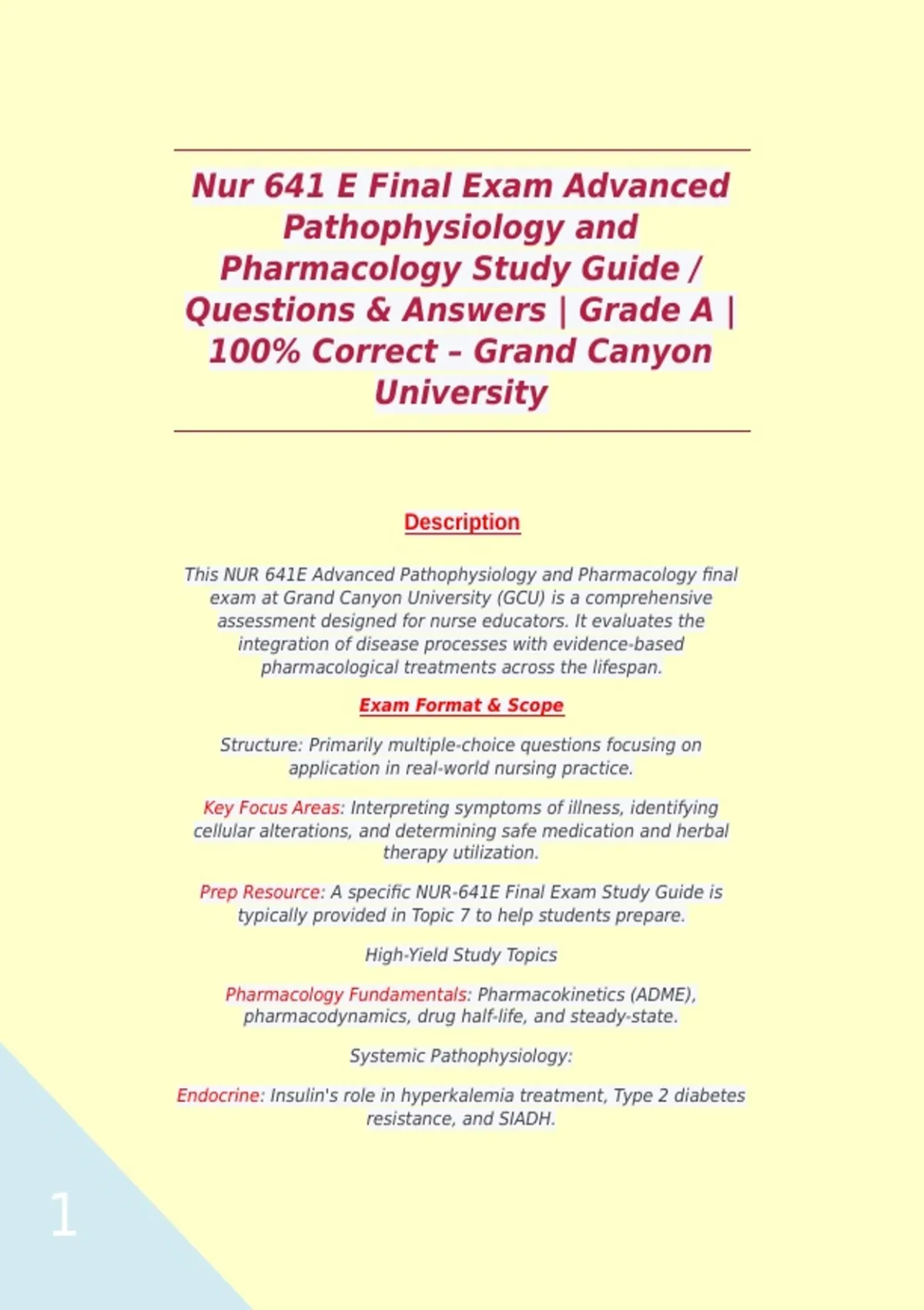 This NUR 641E Advanced Pathophysiology and Pharmacology final