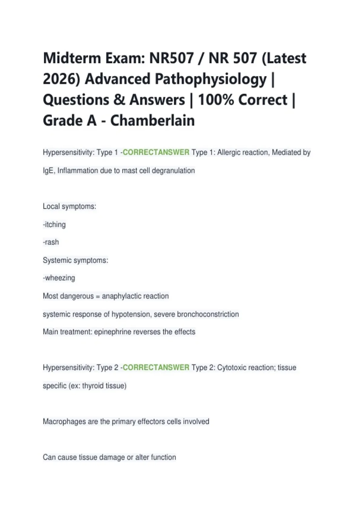 Midterm Exam: NR507 / NR 507 (Latest 2026) Advanced Pathophysiology | Questions & Answers | 100% Correct | Grade A - Chamberlain