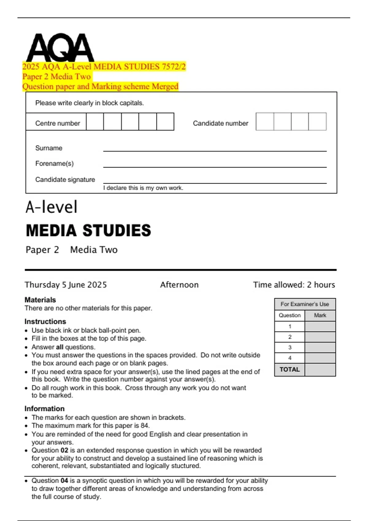2025 AQA A-Level MEDIA STUDIES 7572/2 Paper 2 Media Two Question paper and Marking scheme Merged