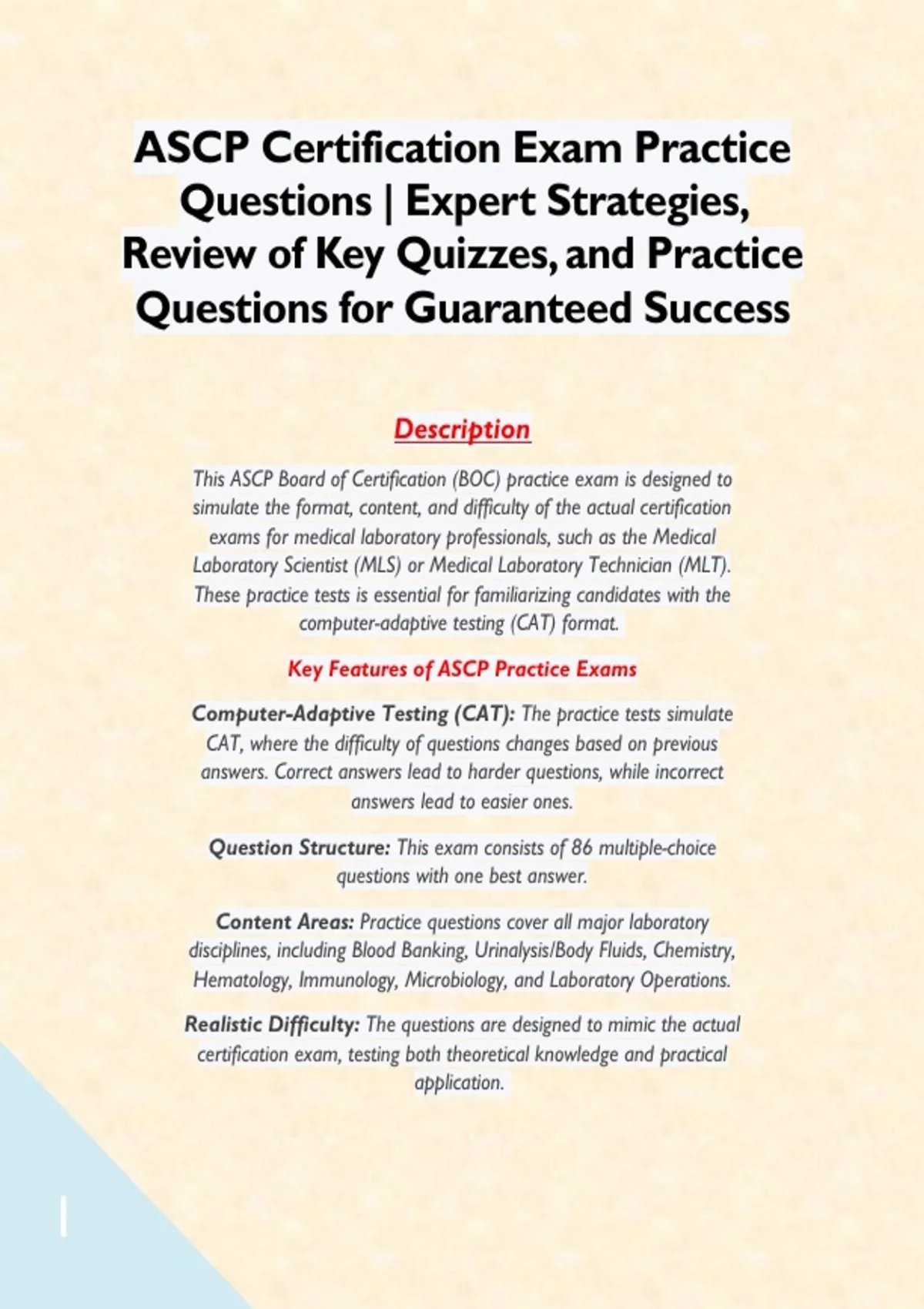 ASCP Certification Exam Practice Questions | Expert Strategies, Review of Key Quizzes, and Practice Questions for Guaranteed Success Description This ASCP Board of Certification (BOC) practice exam is designed to simulate the format, content, and difficulty of the actual certification exams for medical laboratory professionals, such as the Medical Laboratory Scientist (MLS) or Medical Laboratory Technician (MLT). These practice tests is essential for familiarizing candidates with the computer-adaptive testing (CAT) format. Key Features of ASCP Practice Exams Computer-Adaptive Testing (CAT): The practice tests simulate CAT, where the difficulty of questions changes based on previous answers. Correct answers lead to harder questions, while incorrect answers lead to easier ones. Question Structure: This exam consists of 86 multiple-choice questions with one best answer. Content Areas: Practice questions cover all major laboratory disciplines, including Blood Banking, Urinalysis/Body Fluids, Chemistry, Hematology, Immunology, Microbiology, and Laboratory Operations. Realistic Difficulty: The questions are designed to mimic the actual certification exam, testing both theoretical knowledge and practical application.