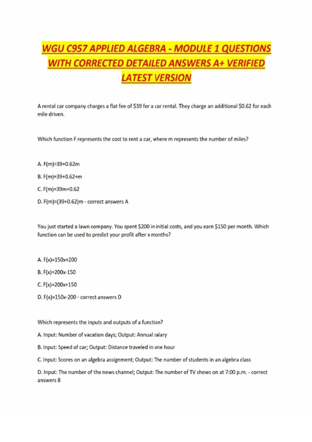 WGU C957 APPLIED ALGEBRA - MODULE 1 QUESTIONS WITH CORRECTED DETAILED ANSWERS A+ VERIFIED LATEST VERSIONWGU C957 APPLIED ALGEBRA - MODULE 1 QUESTIONS WITH CORRECTED DETAILED ANSWERS A+ VERIFIED LATEST VERSIONWGU C957 APPLIED ALGEBRA - MODULE 1 QUESTIONS WITH CORRECTED DETAILED ANSWERS A+ VERIFIED LATEST VERSION