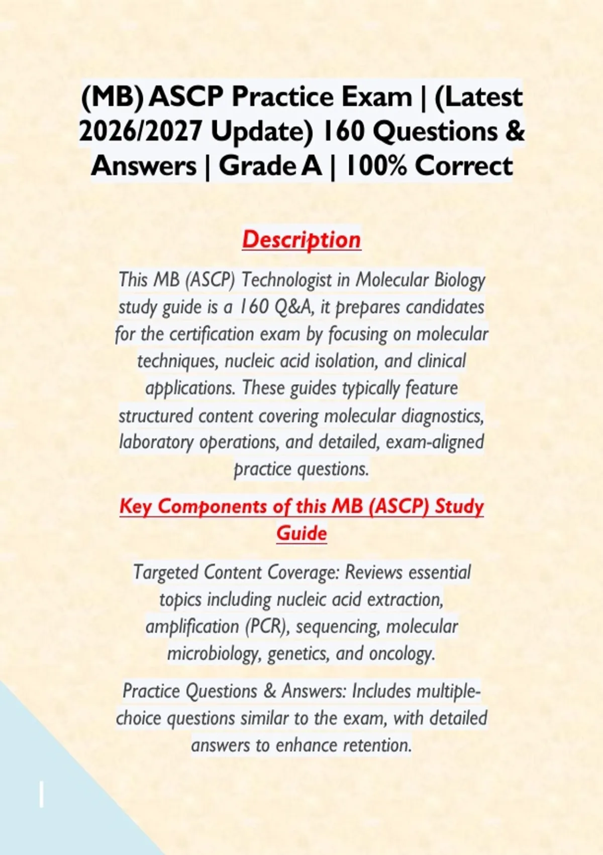 (MB) ASCP Practice Exam | (Latest 2026/2027 Update) 160 Questions & Answers | Grade A | 100% Correct Description This MB (ASCP) Technologist in Molecular Biology study guide is a 160 Q&A, it prepares candidates for the certification exam by focusing on molecular techniques, nucleic acid isolation, and clinical applications. These guides typically feature structured content covering molecular diagnostics, laboratory operations, and detailed, exam-aligned practice questions. Key Components of this MB (ASCP) Study Guide Targeted Content Coverage: Reviews essential topics including nucleic acid extraction, amplification (PCR), sequencing, molecular microbiology, genetics, and oncology. Practice Questions & Answers: Includes multiple-choice questions similar to the exam, with detailed answers to enhance retention.