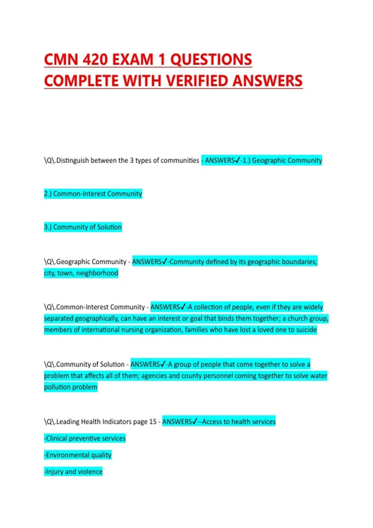 CMN 420 EXAM 1 QUESTIONS COMPLETE WITH VERIFIED ANSWERS Q.Distinguish between the 3 types of communities - ANSWERS-1.) Geographic Community 2.) Common-Interest Community 3.) Community of Solution Q.Geographic Community - ANSWERS-Community defined by its geographic boundaries; city, town, neighborhood Q.Common-Interest Community - ANSWERS-A collection of people, even if they are widely separated geographically, can have an interest or goal that binds them together; a church group, members of international nursing organization, families who have lost a loved one to suicide Q.Community of Solution - ANSWERS-A group of people that come together to solve a problem that affects all of them; agencies and county personnel coming together to solve water pollution problem Q.Leading Health Indicators page 15 - ANSWERS--Access to health services -Clinical preventive services -Environmental quality -Injury and violence -Maternal, Infant, and Child health -Mental health -Nutrition, physical activity, and obesity -Oral health -Reproductive and sexual health -Social determinants -Substance abuse -Tobacco Q.Qualities of a Healthy Community - ANSWERS--Equity (lack of disparities) -A strong economy and employment opportunities (lack of poverty) -Education -Health care and preventive health services -A stable, sustainable ecosystem and environment -Inclusive, equitable, and broad community participation -Employ environmental strategies -Engage multi sector participation -The capacity to assess and address their own health concerns -Collaboration between partners -Housing/shelter -Civic engagement -Healthy public policy -Access to healthy food -Safety -Opportunities for active learning -Transportation -Empowered population -Healthy child development -Use data to guide and measure efforts Q.Primary Prevention - ANSWERS-Prevention; measures taken to keep illness or injury from occurring Q.Secondary Prevention - ANSWERS-Screening; efforts taken to detect and treat existing health conditions at the earliest possible stage, when disease or impairment is already present Q.Tertiary Prevention - ANSWERS-Tertiary Prevention Treatment; attempts to reduce the extent of severity of a health problem to its lowest possible level, so as to minimize disability and restore or preserve function. Q.Health Promotion - ANSWERS-Includes all efforts that seek to move people closer to optimal well-being or higher levels of wellness; health education, preventive health care services, wellness programs Q.Disease Prevention - ANSWERS-Anticipating and averting health problems or discovering them as early as possible in order to minimize potential disability or impairment Q.The Core Public Health Functions Basic to CH Nursing - ANSWERS-1.) Assessment 2.) Policy Development 3.) Assurance