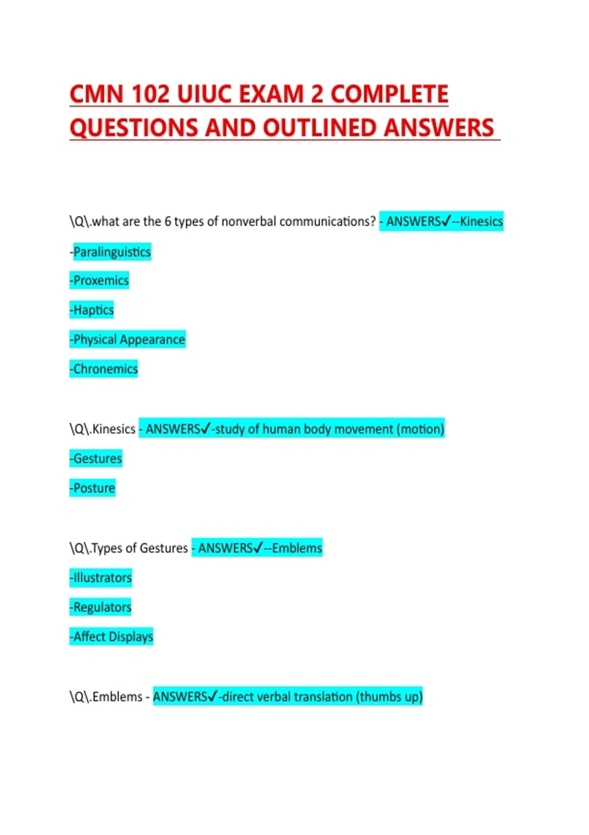 CMN 102 UIUC EXAM 2 COMPLETE QUESTIONS AND OUTLINED ANSWERS Q.what are the 6 types of nonverbal communications? - ANSWERS--Kinesics -Paralinguistics -Proxemics -Haptics -Physical Appearance -Chronemics Q.Kinesics - ANSWERS-study of human body movement (motion) -Gestures -Posture Q.Types of Gestures - ANSWERS--Emblems -Illustrators -Regulators -Affect Displays Q.Emblems - ANSWERS-direct verbal translation (thumbs up) Q.Illustrators - ANSWERS-directly related to speech & no meaning without spoken words (the fish was this big) Q.Regulators - ANSWERS-regulates convos Q.Affect Displays - ANSWERS-facial/body expression that shows an emotion Q.Paralanguage - ANSWERS-how words are spoken -volume -speech rate - pitch -Intonation Q.Appearance - ANSWERS-how we look shapes the way people think about us Q.Proxemics: Intimate Distance - ANSWERS-contact to 18 inches Q.Proxemics: Personal Distance - ANSWERS-18 inches to 4 feet Q.Proxemics: Social Distance - ANSWERS-4 to 12 feet Q.Proxemics: Public Distance - ANSWERS-12 feet to within sight Q.Chronemics - ANSWERS-time Q.Repeat - ANSWERS-saying "hi" while waving Q.Contradict - ANSWERS-little boy hiding behind his mom while saying "I'm not afraid of the dog" Q.Complement - ANSWERS-a women sits slouched as her boss tells her how displeased he is with her work Q.Substitute - ANSWERS-your friends ask you how you are liking your class and you just roll your eyes Q.Regulate - ANSWERS-teacher asks a question but then moves on before there is a response Q.Functions of Nonverbal Communications - ANSWERS--providing info -assisting word retrieval -regulating interaction -expressing intimacy -managing/conveying identity -facilitating task goals
