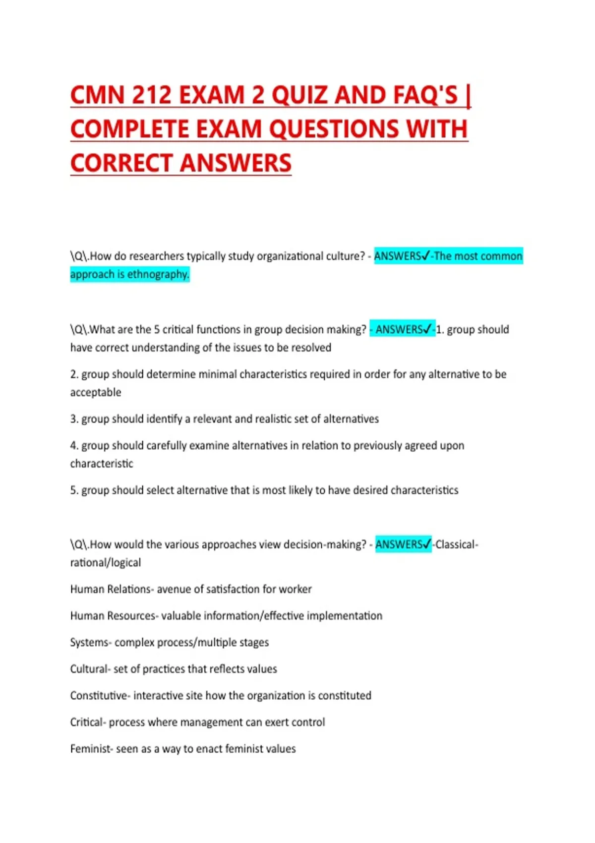 CMN 212 EXAM 2 QUIZ AND FAQ'S | COMPLETE EXAM QUESTIONS WITH CORRECT ANSWERS Q.How do researchers typically study organizational culture? - ANSWERS-The most common approach is ethnography. Q.What are the 5 critical functions in group decision making? - ANSWERS-1. group should have correct understanding of the issues to be resolved 2. group should determine minimal characteristics required in order for any alternative to be acceptable 3. group should identify a relevant and realistic set of alternatives 4. group should carefully examine alternatives in relation to previously agreed upon characteristic 5. group should select alternative that is most likely to have desired characteristics Q.How would the various approaches view decision-making? - ANSWERS-Classical- rational/logical Human Relations- avenue of satisfaction for worker Human Resources- valuable information/effective implementation Systems- complex process/multiple stages Cultural- set of practices that reflects values Constitutive- interactive site how the organization is constituted Critical- process where management can exert control Feminist- seen as a way to enact feminist values Q.Within the critical approaches, what are the consequences of sequestering sexual harassment for organizations and for the women sexually harassed? - ANSWERS-Excuses: -It'll hurt the organization if you pursue a sexual harassment claim; -Deny or disguise the problem by denying that the organization condones harassment -Its just natural for men to be playful and do these things. Sequestering sexual harassment enables the organization to continue on with business as usual without having to deal with lawsuits or disciplining the harassers. For the women, it results in disempowerment and, of course, the negative effects of the sexual harassment. Q.According to the readings, _____________ are interactional, contextual, episodic and improvisational. Select one: a. The sites of culture b. The "core" assumptions of culture c. Cultural performances d. Schein's three levels of culture - ANSWERS-C. Cultural performances Q.According to the readings, the four key components of Deal and Kennedy's "strong cultures" are: Select one: a. Values, artifacts, heroes, and belief systems b. Values, heroes, rites/rituals, and the cultural network c. Heroes, rites/rituals, artifacts, and values d. Artifacts, values, stories, and basic assumptions - ANSWERS-B. Values, héros, rites/rituals, and the cultural network Q.According to the lesson, which of the following is (are) function(s) that cultures perform? Select one: a. They provide a shared frame of reference b. They reduce uncertainty c. They fulfill a need for community d. All of the above e. A and B - ANSWERS-D. All of the above Q.According to the lesson, which of the following is not an assumption of the prescriptive view of culture? Select one: a. Organizations can shape and define their cultures b. The organization should cultivate a culture that makes it more effective c. There may be multiple cultures and subcultures in an organization d. All organizations have cultures in addition to other properties, such as structure, size, complexity, etc. e. Culture influences member behavior and organizational effectiveness - ANSWERS-C. There may be multiple cultures and subcultures in an organization Q.According to the readings, the second level of Schein's model of culture is the "core" assumptions that individuals in a group hold about the world and how it works.