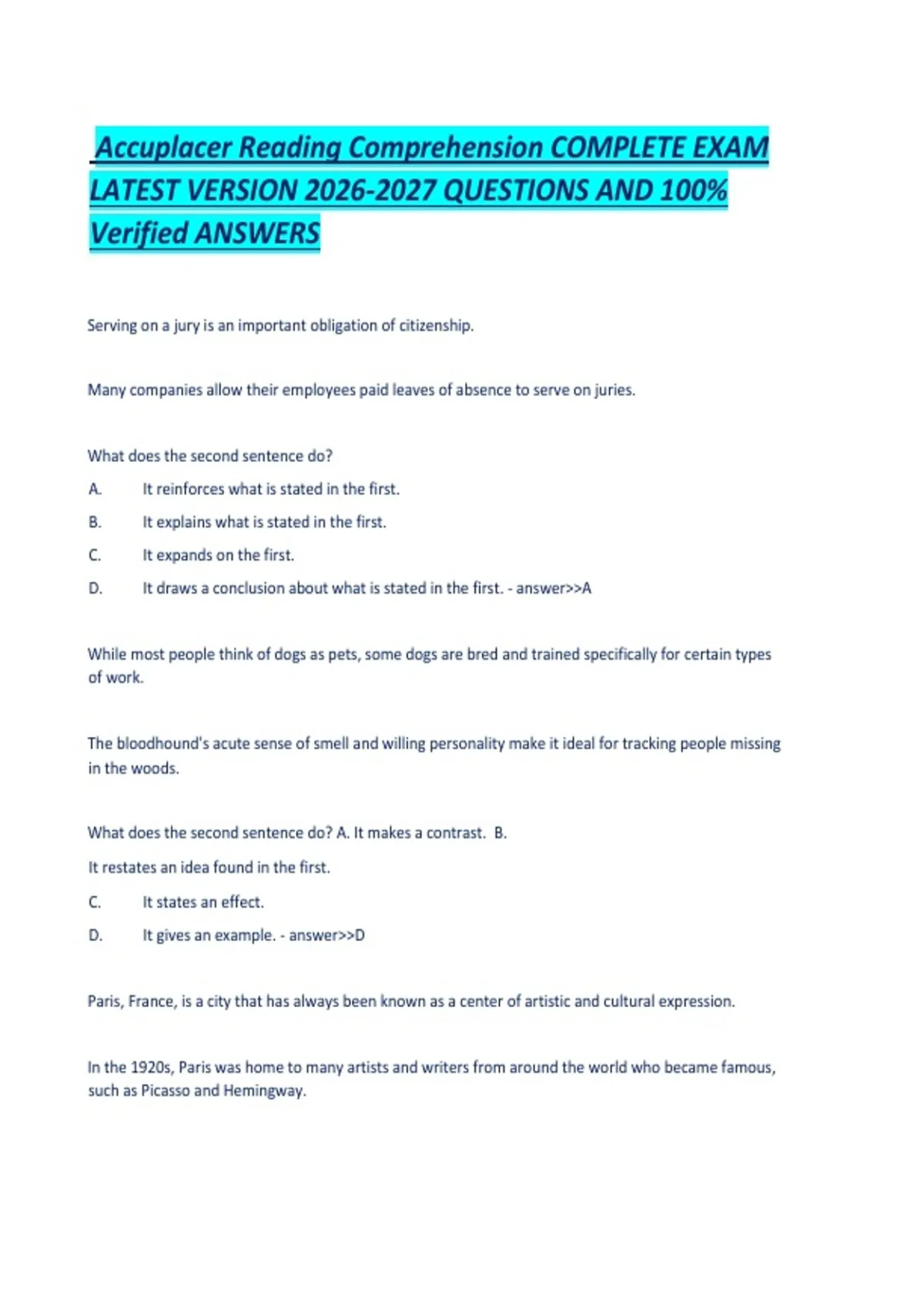 Accuplacer Reading Comprehension COMPLETE EXAM LATEST VERSION QUESTIONS AND 100- Verified ANSWERS.pdf