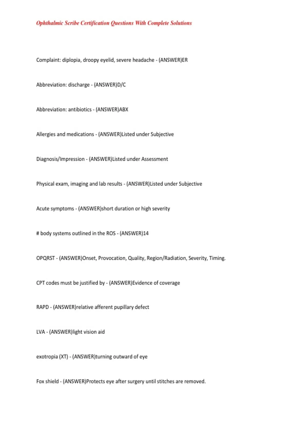 Ophthalmic Scribe Certification Questions With Complete Solutions