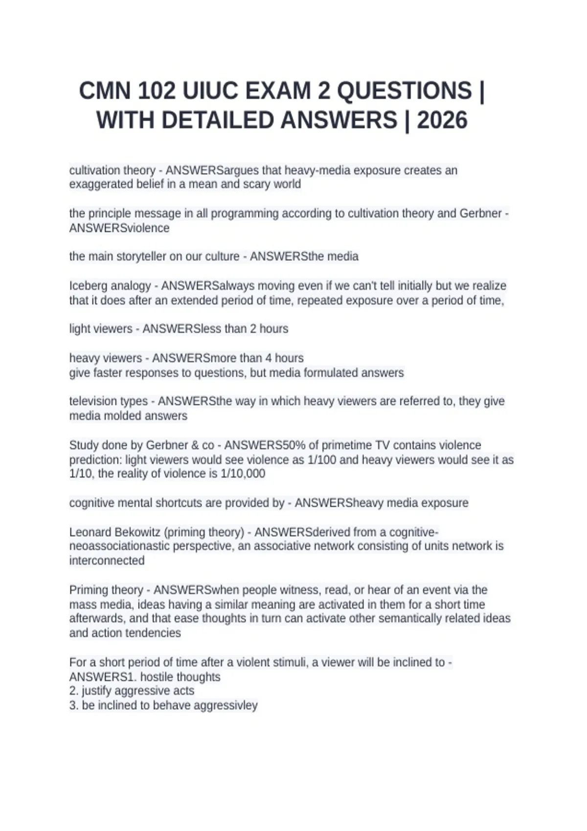 cultivation theory - ANSWERSargues that heavy-media exposure creates an exaggerated belief in a mean and scary world the principle message in all programming according to cultivation theory and Gerbner - ANSWERSviolence the main storyteller on our culture - ANSWERSthe media Iceberg analogy - ANSWERSalways moving even if we can't tell initially but we realize that it does after an extended period of time, repeated exposure over a period of time, light viewers - ANSWERSless than 2 hours heavy viewers - ANSWERSmore than 4 hours give faster responses to questions, but media formulated answers television types - ANSWERSthe way in which heavy viewers are referred to, they give media molded answers Study done by Gerbner & co - ANSWERS50% of primetime TV contains violence prediction: light viewers would see violence as 1/100 and heavy viewers would see it as 1/10, the reality of violence is 1/10,000 cognitive mental shortcuts are provided by - ANSWERSheavy media exposure Leonard Bekowitz (priming theory) - ANSWERSderived from a cognitive-neoassociationastic perspective, an associative network consisting of units network is