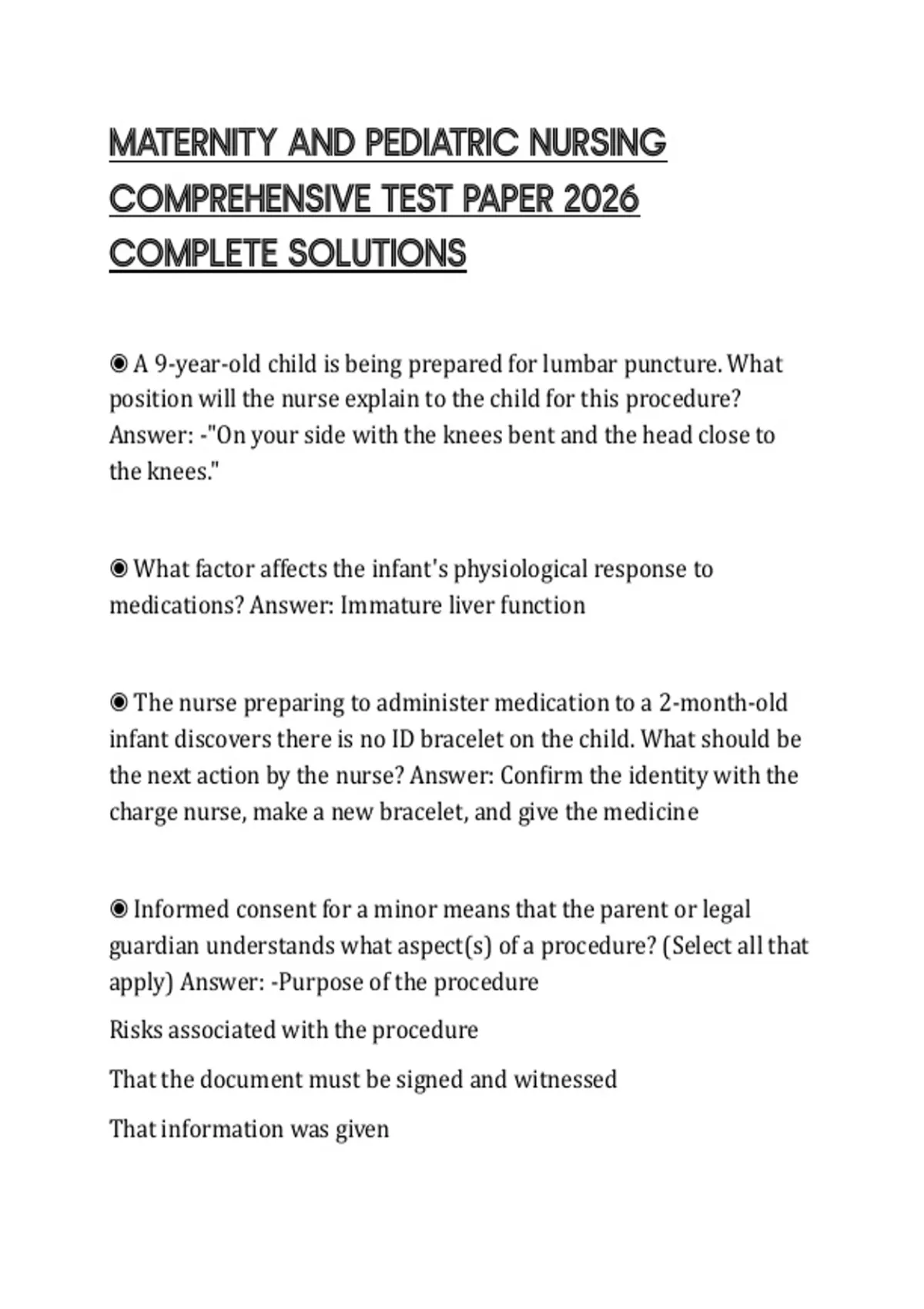 MATERNITY AND PEDIATRIC NURSING COMPREHENSIVE TEST PAPER 2026 COMPLETE SOLUTIONS