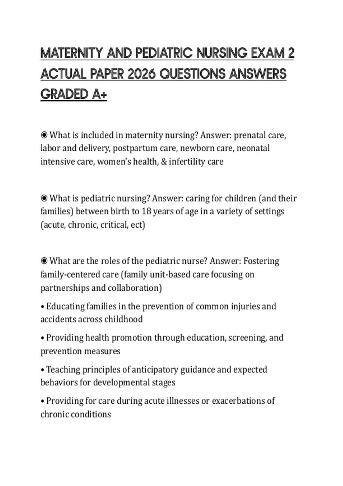 MATERNITY AND PEDIATRIC NURSING EXAM 2 ACTUAL PAPER 2026 QUESTIONS ANSWERS GRADED A+