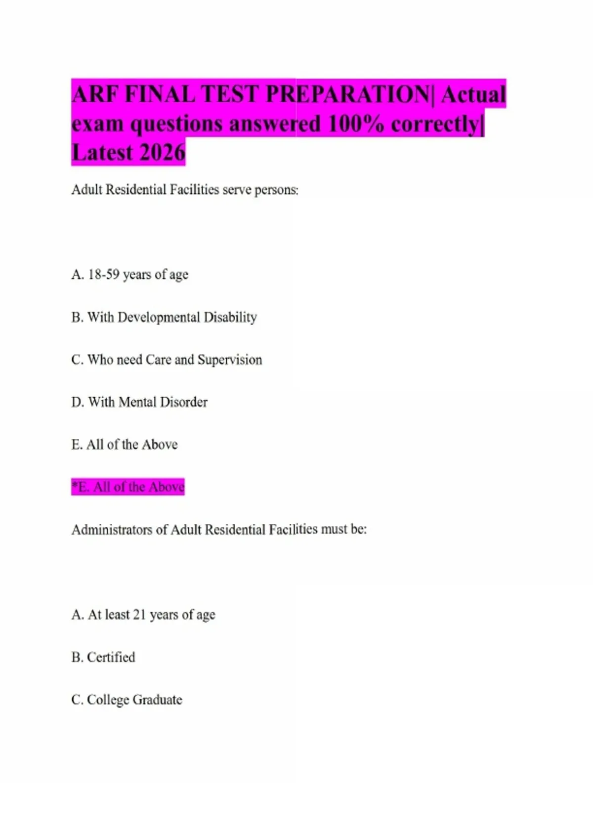 ARF FINAL TEST PREPARATION| Actual exam questions answered 100% correctly| Latest 2026 Adult Residential Facilities serve persons: A. 18-59 years of age B. With Developmental Disability C. Who need Care and Supervision D. With Mental Disorder E. All of the Above *E. All of the Above Administrators of Adult Residential Facilities must be: A. At least 21 years of age B. Certified C. College Graduate D. At least 18 years of age E. Both A & B *E. Both A & B Prior to admitting a person with Mental Disorder the facility must obtain: A. Approval from Community Care Licensing B. Mental Health Assessment C. Physician's Order D. All of the Above *D. All of the Above What must be included in every advertisement for the facility? A. Name of Licensee B. Capacity C. Facility License Number D. Address of facility E. All of the above *C. Facility License Number A room approved for ambulatory clients may be used by: A. ambulatory clients B. ambulatory or nonambulatory clients who rely on a walker C. ambulatory clients and nonambulatory clients in an emergency situation, not to exceed 5 working days D. ambulatory clients and clients who are transfer dependent *A. ambulatory clients What is included in the facility license application? A. name or proposed name of the facility B. name and address of owner of facility premises of applicant is renting or leasing C. information concerning the city or county fire department having jurisdiction in the area where the facility is located
