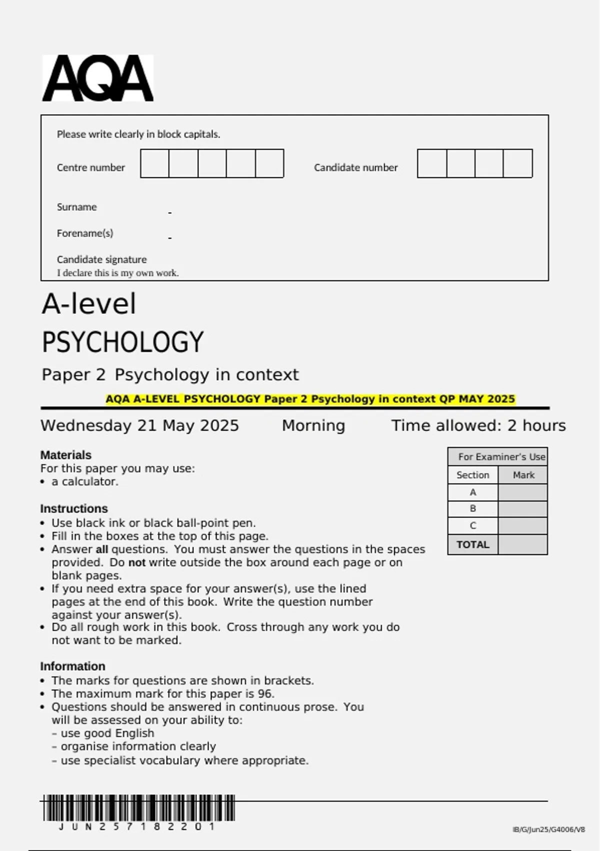 AQA A-LEVEL PSYCHOLOGY Paper 2 Psychology in context QP MAY 2025