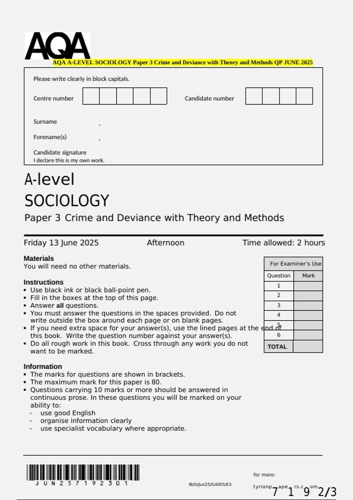AQA A-LEVEL SOCIOLOGY Paper 3 Crime and Deviance with Theory and Methods QP JUNE 2025