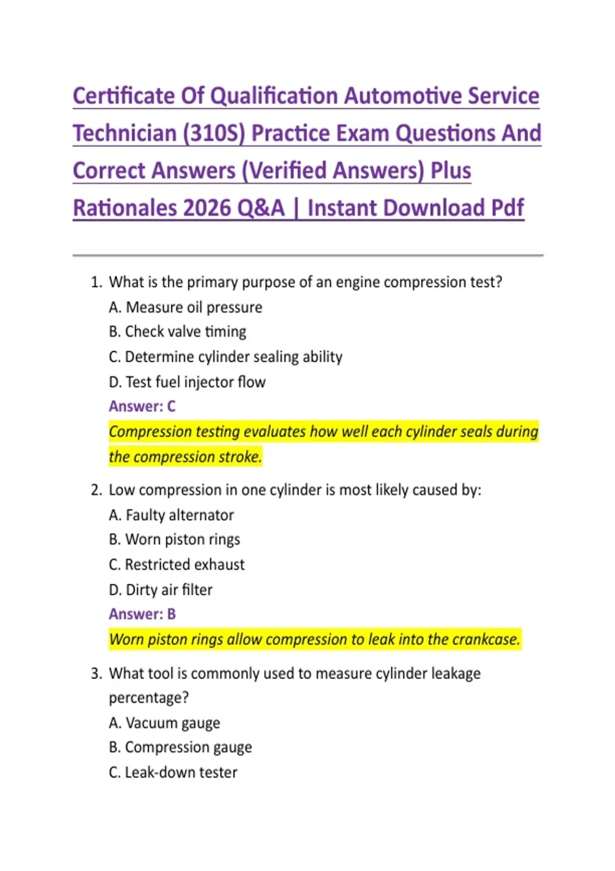 Certificate Of Qualification Automotive Service Technician (310S) Practice Exam Questions And Correct Answers (Verified Answers) Plus Rationales 2026 Q&A | Instant Download Pdf