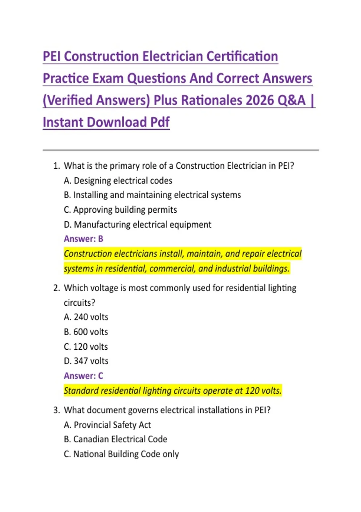 PEI Construction Electrician Certification Practice Exam Questions And Correct Answers (Verified Answers) Plus Rationales 2026 Q&A | Instant Download Pdf