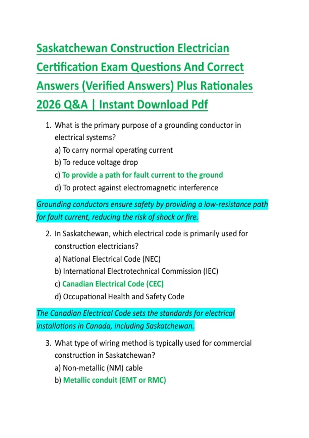 Saskatchewan Construction Electrician Certification Exam Questions And Correct Answers (Verified Answers) Plus Rationales 2026 Q&A | Instant Download Pdf