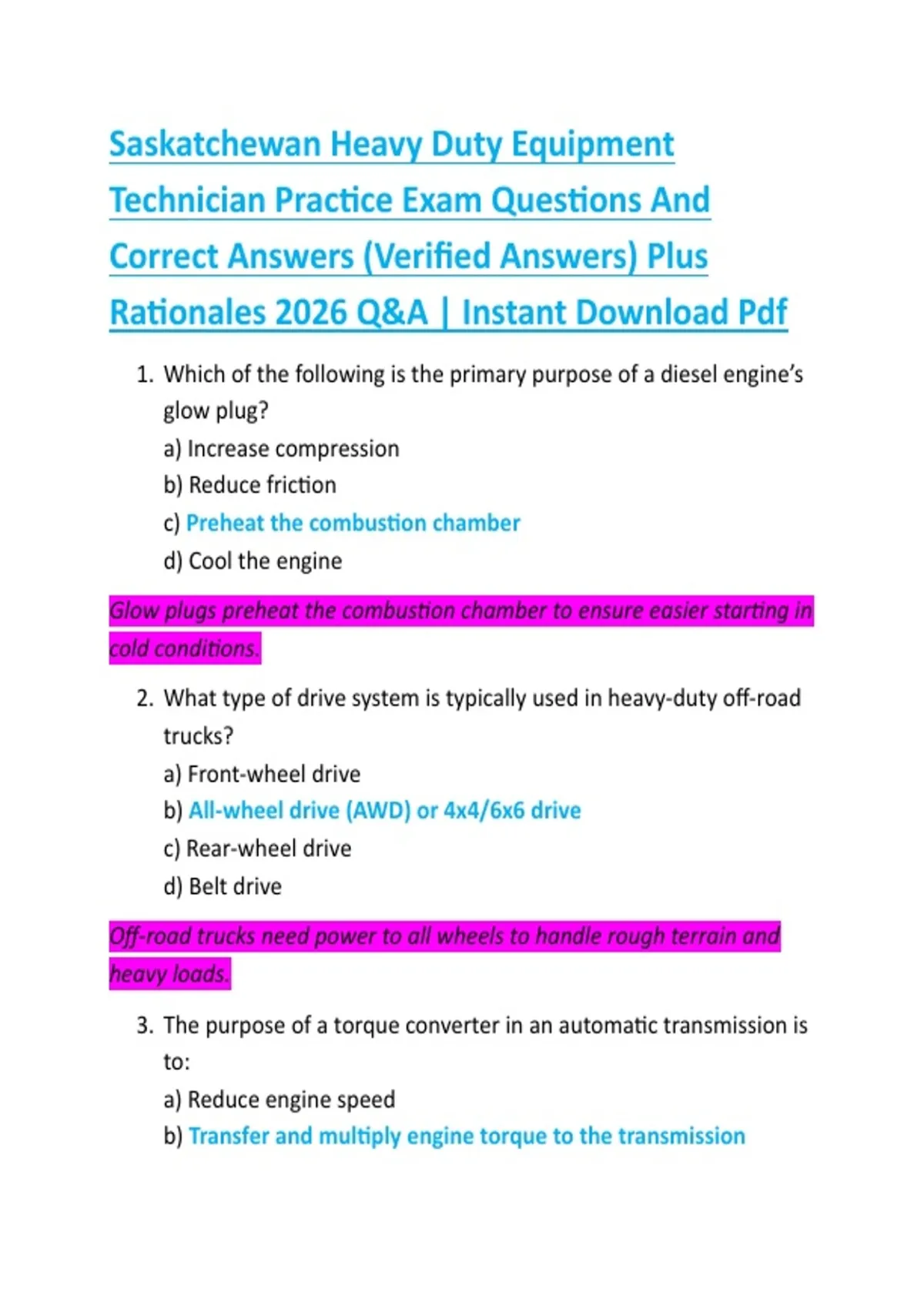 Saskatchewan Heavy Duty Equipment Technician Practice Exam Questions And Correct Answers (Verified Answers) Plus Rationales 2026 Q&A | Instant Download Pdf