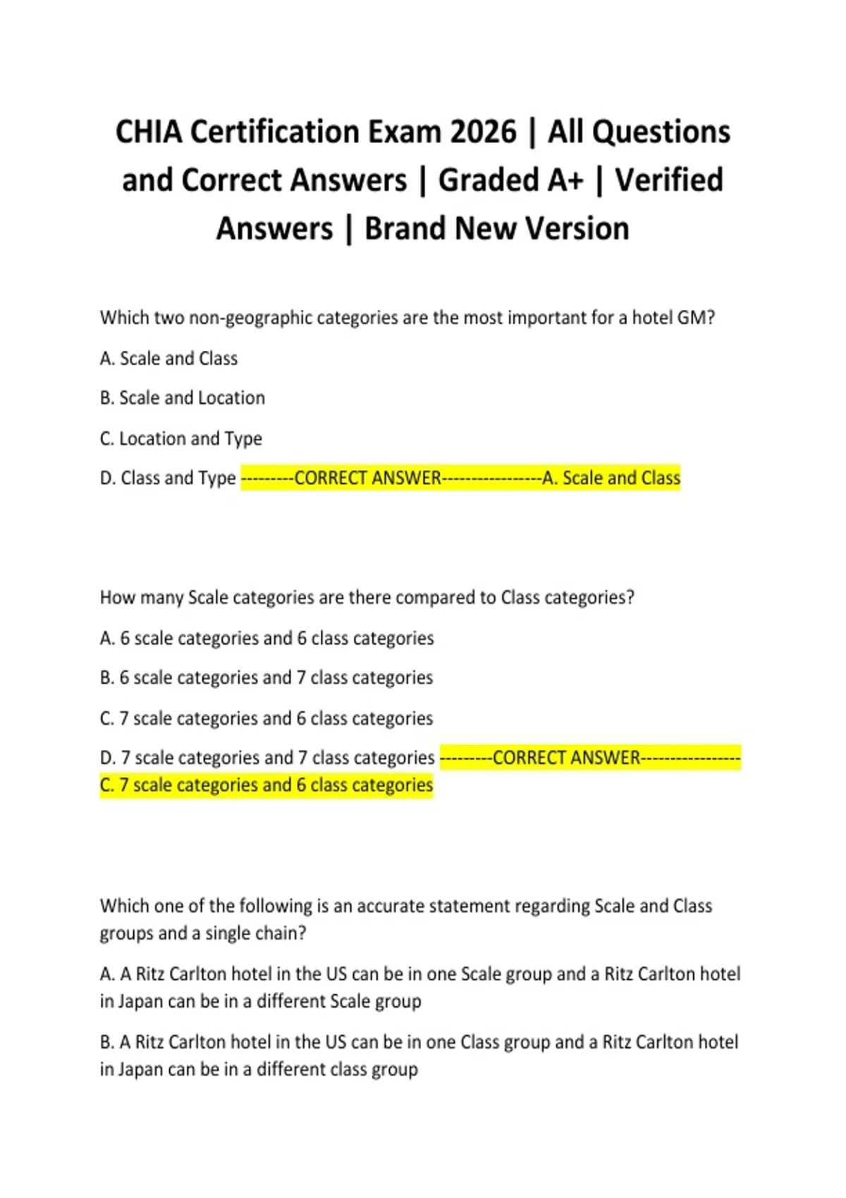,C. A Ritz Carlton hotel will always be in the same Scale and Class groups in every