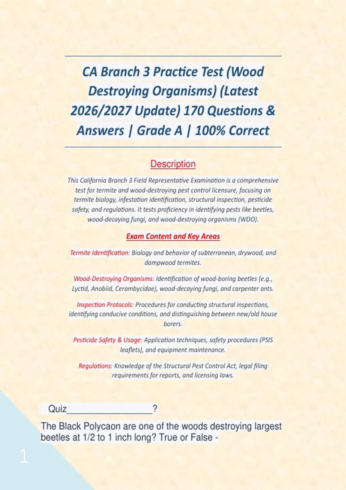 CA Branch 3 Practice Test (Wood Destroying Organisms) (Latest 2026/2027 Update) 170 Questions & Answers | Grade A | 100% Correct Description This California Branch 3 Field Representative Examination is a comprehensive test for termite and wood-destroying pest control licensure, focusing on termite biology, infestation identification, structural inspection, pesticide safety, and regulations. It tests proficiency in identifying pests like beetles, wood-decaying fungi, and wood-destroying organisms (WDO). Exam Content and Key Areas Termite Identification: Biology and behavior of subterranean, drywood, and dampwood termites. Wood-Destroying Organisms: Identification of wood-boring beetles (e.g., Lyctid, Anobiid, Cerambycidae), wood-decaying fungi, and carpenter ants. Inspection Protocols: Procedures for conducting structural inspections, identifying conducive conditions, and distinguishing between new/old house borers. Pesticide Safety & Usage: Application techniques, safety procedures (PSIS leaflets), and equipment maintenance. Regulations: Knowledge of the Structural Pest Control Act, legal filing requirements for reports, and licensing laws.