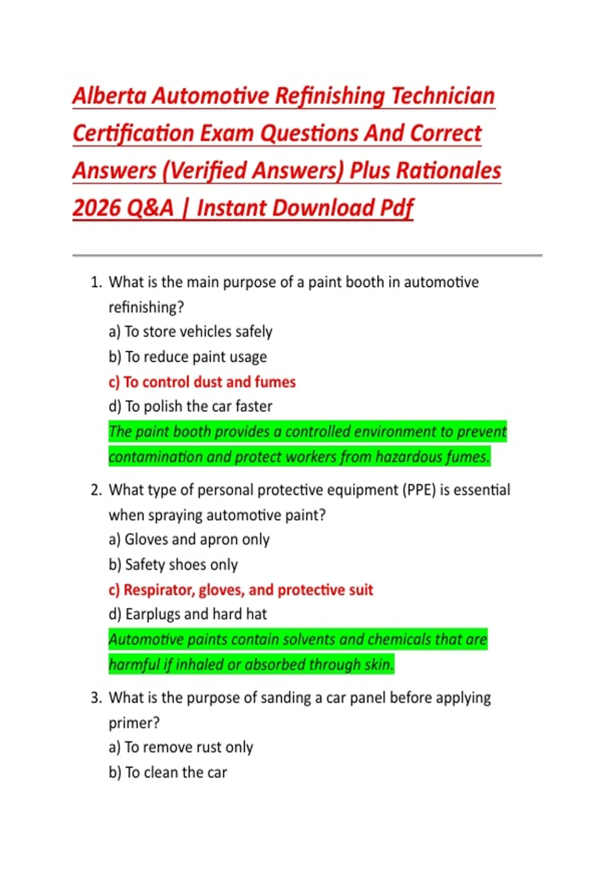Alberta Automotive Refinishing Technician Certification Exam Questions And Correct Answers (Verified Answers) Plus Rationales 2026 Q&A | Instant Download Pdf