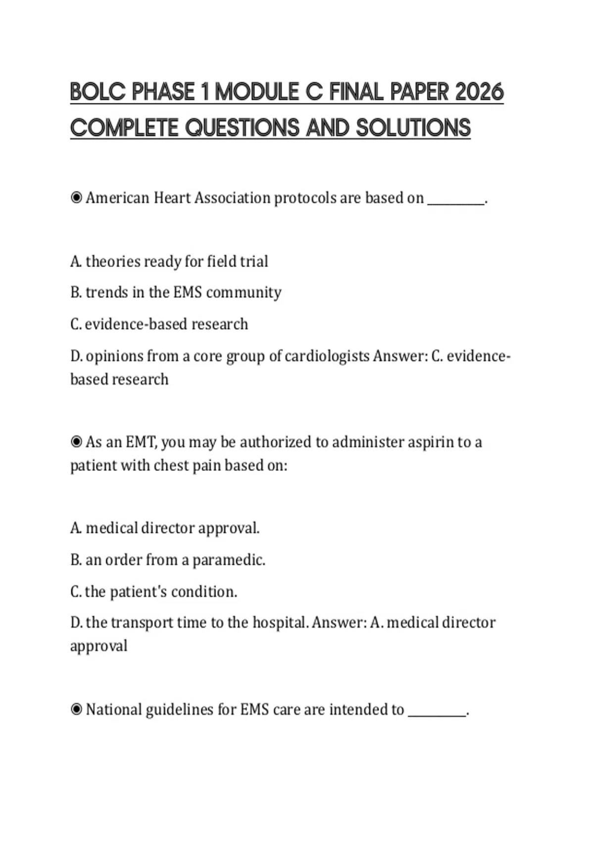 ◉ Prehospital patient care decisions should be based on __________.