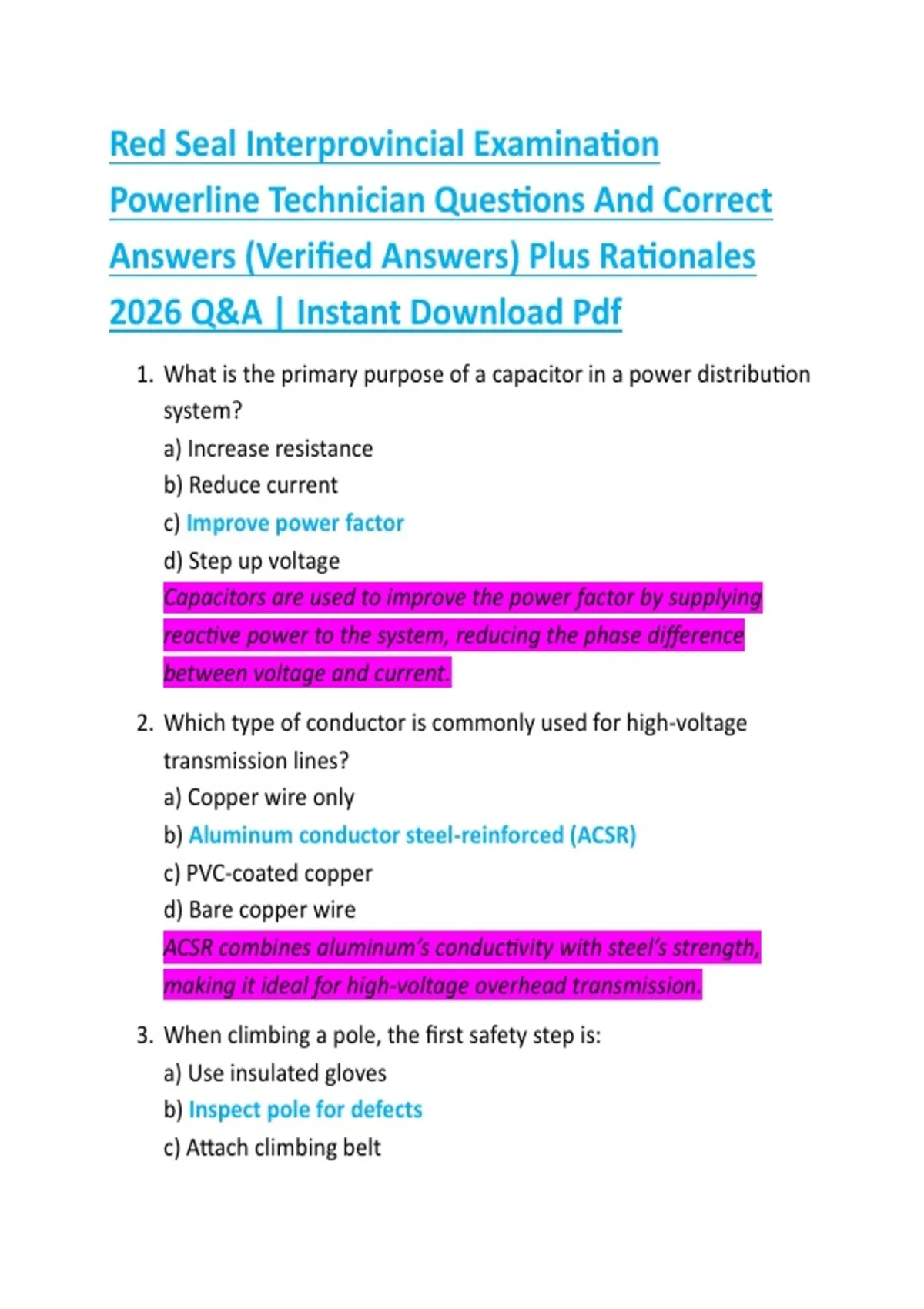 Red Seal Interprovincial Examination Powerline Technician Questions And Correct Answers (Verified Answers) Plus Rationales 2026 Q&A | Instant Download Pdf