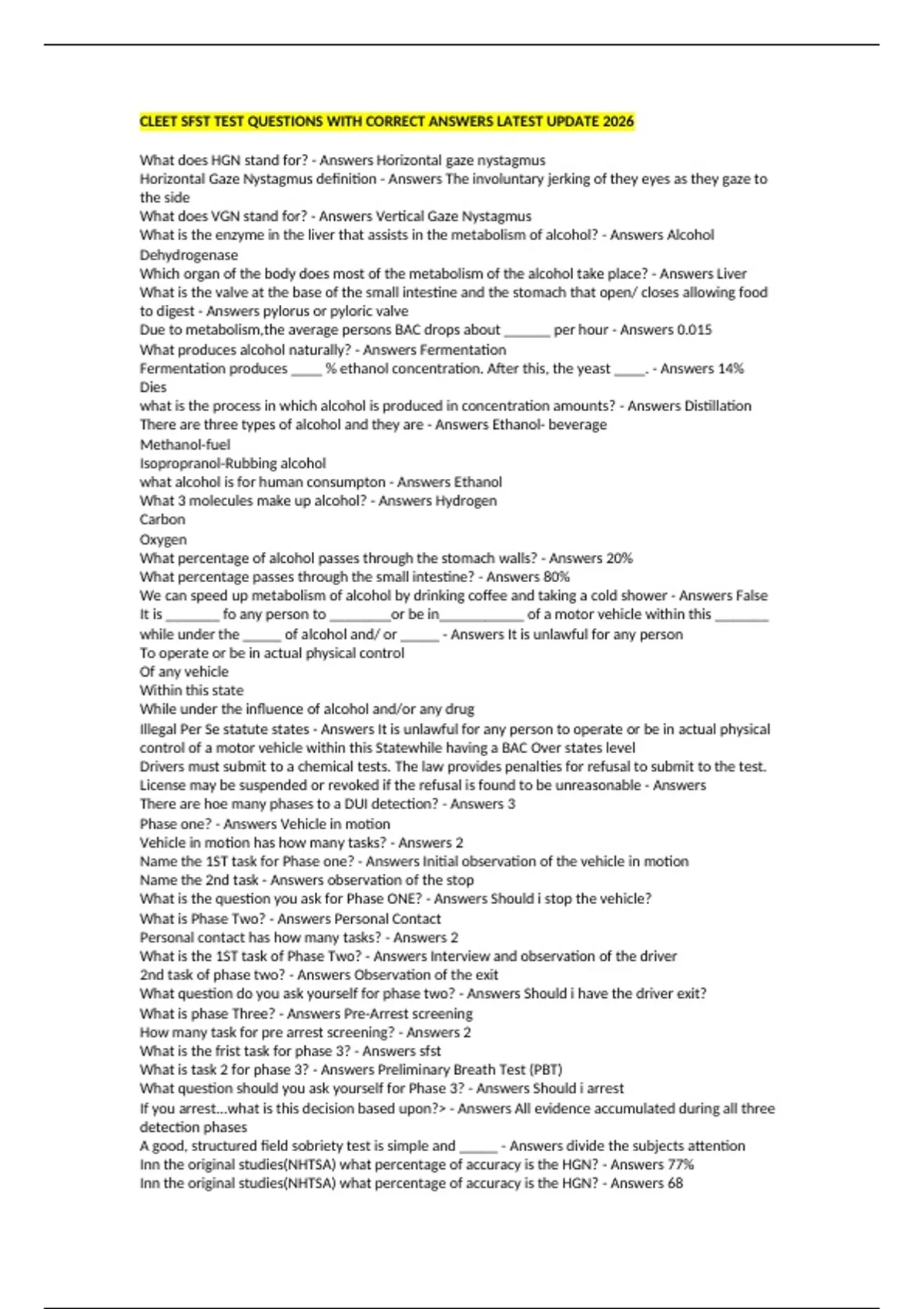 CLEET SFST TEST QUESTIONS WITH CORRECT ANSWERS LATEST UPDATE 2026 What does HGN stand for? - Answers Horizontal gaze nystagmus Horizontal Gaze Nystagmus definition - Answers The involuntary jerking of they eyes as they gaze to the side What does VGN stand for? - Answers Vertical Gaze Nystagmus What is the enzyme in the liver that assists in the metabolism of alcohol? - Answers Alcohol Dehydrogenase Which organ of the body does most of the metabolism of the alcohol take place? - Answers Liver What is the valve at the base of the small intestine and the stomach that open/ closes allowing food to digest - Answers pylorus or pyloric valve Due to metabolism,the average persons BAC drops about ______ per hour - Answers 0.015 What produces alcohol naturally? - Answers Fermentation Fermentation produces ____ % ethanol concentration. After this, the yeast ____. - Answers 14% Dies what is the process in which alcohol is produced in concentration amounts? - Answers Distillation There are three types of alcohol and they are - Answers Ethanol- beverage Methanol-fuel Isopropranol-Rubbing alcohol what alcohol is for human consumpton - Answers Ethanol What 3 molecules make up alcohol? - Answers Hydrogen Carbon Oxygen What percentage of alcohol passes through the stomach walls? - Answers 20% What percentage passes through the small intestine? - Answers 80% We can speed up metabolism of alcohol by drinking coffee and taking a cold shower - Answers False It is _______ fo any person to ________or be in___________ of a motor vehicle within this _______ while under the _____ of alcohol and/ or _____ - Answers It is unlawful for any person To operate or be in actual physical control Of any vehicle Within this state While under the influence of alcohol and/or any drug Illegal Per Se statute states - Answers It is unlawful for any person to operate or be in actual physical control of a motor vehicle within this Statewhile having a BAC Over states level Drivers must submit to a chemical tests. The law provides penalties for refusal to submit to the test. License may be suspended or revoked if the refusal is found to be unreasonable - Answers There are hoe many phases to a DUI detection? - Answers 3 Phase one? - Answers Vehicle in motion Vehicle in motion has how many tasks? - Answers 2 Name the 1ST task for Phase one? - Answers Initial observation of the vehicle in motion Name the 2nd task - Answers observation of the stop What is the question you ask for Phase ONE? - Answers Should i stop the vehicle? What is Phase Two? - Answers Personal Contact Personal contact has how many tasks? - Answers 2 What is the 1ST task of Phase Two? - Answers Interview and observation of the driver 2nd task of phase two? - Answers Observation of the exit What question do you ask yourself for phase two? - Answers Should i have the driver exit? What is phase Three? - Answers Pre-Arrest screening How many task for pre arrest screening? - Answers 2 What is the frist task for phase 3? - Answers sfst What is task 2 for phase 3? - Answers Preliminary Breath Test (PB