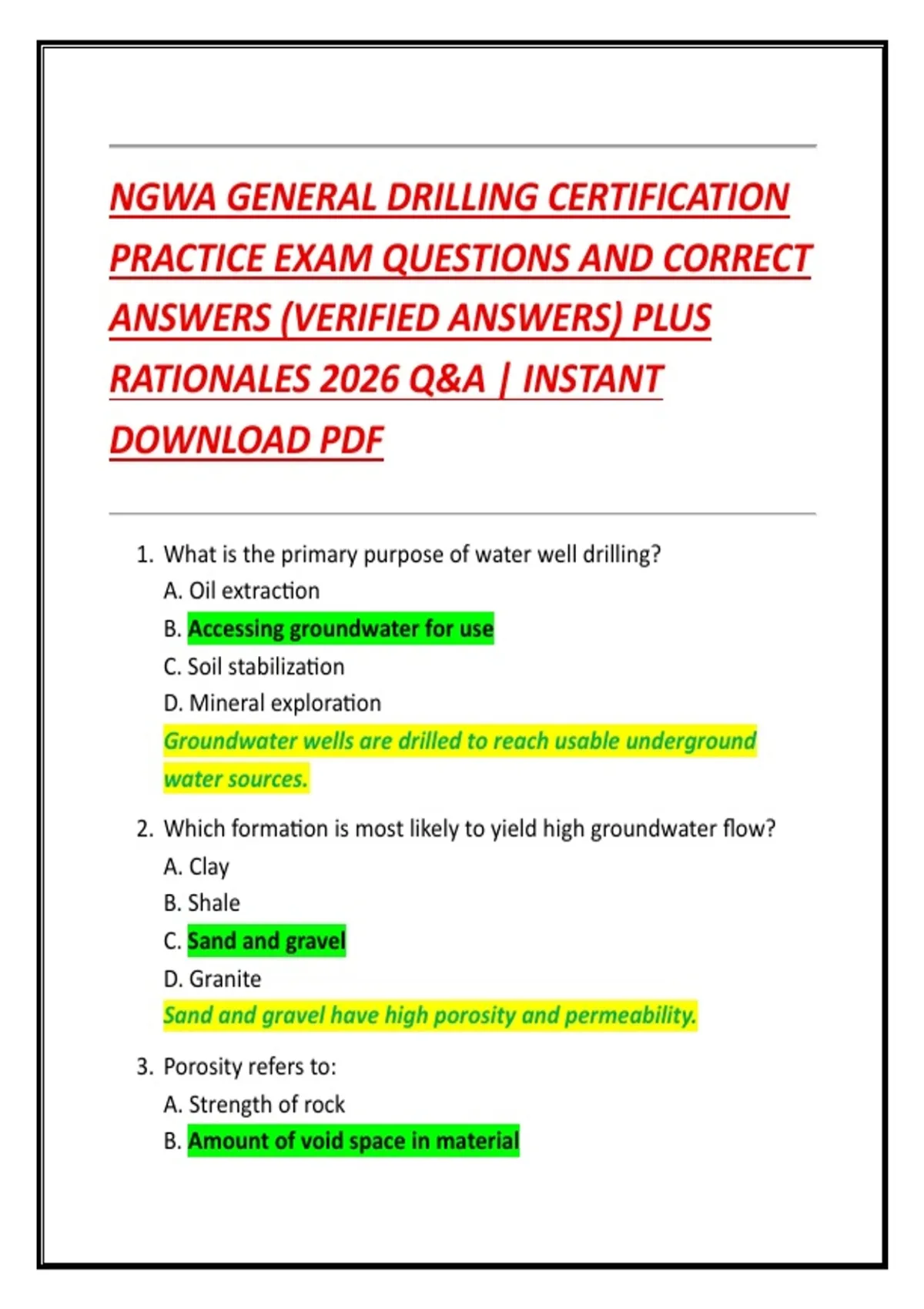 NGWA GENERAL DRILLING CERTIFICATION PRACTICE EXAM QUESTIONS AND CORRECT ANSWERS (VERIFIED ANSWERS) PLUS RATIONALES 2026 Q&A | INSTANT DOWNLOAD PDF