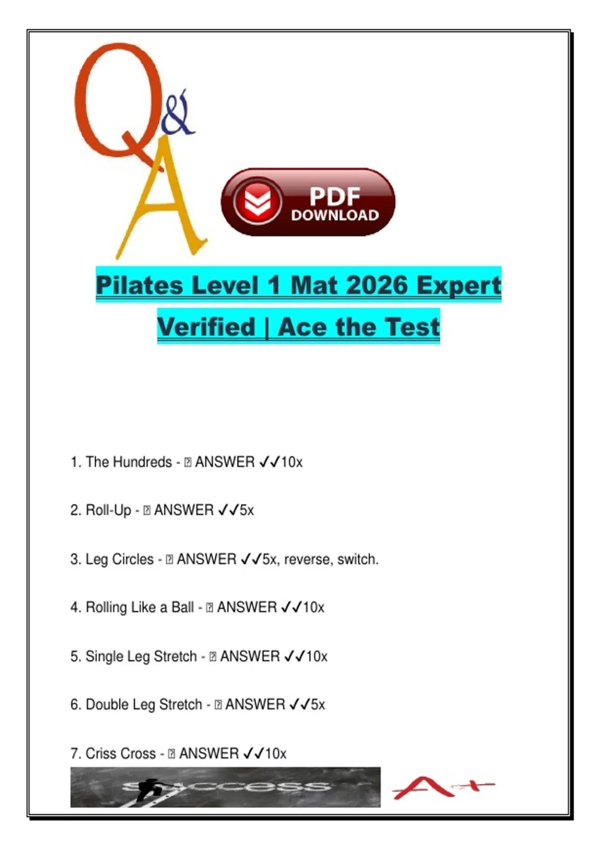 This concise, expert-verified document outlines 12 core mat exercises from the Peak Pilates Level 1 Mat syllabus, complete with precise repetition counts and movement instructions. Designed to reinforce classical Pilates technique and readiness for the 2026 certification, the Q&A format simplifies retention and improves instructional clarity. Exercises covered include: Core-focused fundamentals like The Hundreds, Roll-Up, and Criss Cross Spinal mobility drills including Spine Stretch Forward, Saw, and Neck Pull Strength and balance moves such as Rolling Like a Ball, Teaser, and Side Kicks (Point Up/Flex Down, Circles) Flexibility and full-body integration through Leg Circles, Single and Double Leg Stretch Each entry specifies the recommended reps (e.g., Roll-Up – 5x, Teaser – 5x, Side Kicks – 10x, 10x, 5x, reverse), making it a reliable guide for class planning or personal training. This material is ideal for: Pilates instructor candidates preparing for Level 1 Mat certification Fitness professionals or rehab specialists incorporating Pilates Students in movement therapy, exercise science, or body conditioning courses Anyone seeking a quick-reference summary of foundational mat routines within the Peak Pilates method Keywords: Peak Pilates, Level 1 mat, Pilates exam prep, Pilates Q&A, classical Pilates, The Hundreds, Roll-Up, Criss Cross, Side Kicks, Teaser, Spine Stretch, Leg Circles, Pilates reps, Pilates teacher training, Pilates exercises, mat certification, Pilates routines