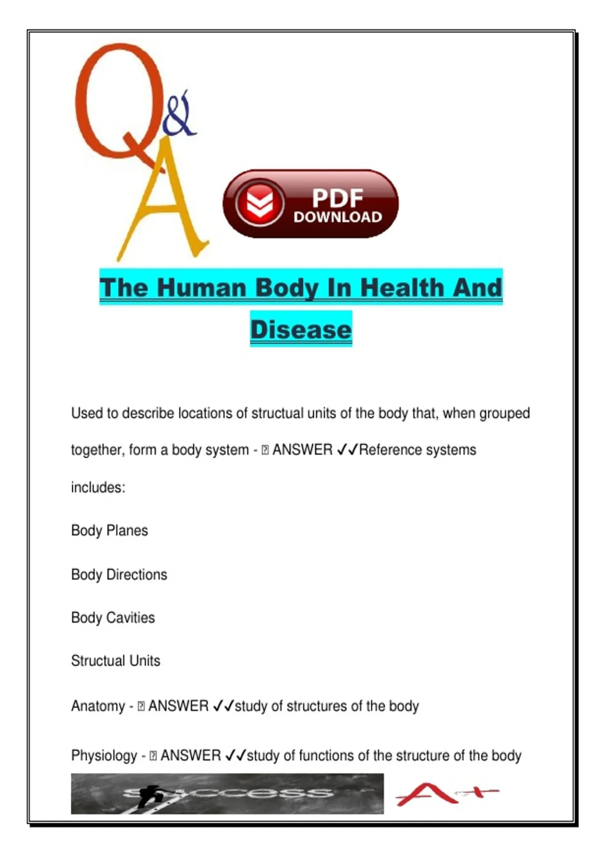 This document contains over 50 expert-verified questions and answers from The Human Body in Health and Disease course content, organized in a concise and test-ready format. It focuses on foundational anatomical terminology and systems relevant to early-level healthcare and life science studies. This resource supports mastery of structure-location relationships, directional terms, and body planes—essential for success in anatomy, medical assisting, and pre-nursing programs. Topics covered in depth include: Reference systems: body planes (midsagittal, transverse, frontal), directions (anterior, posterior, superior, inferior, proximal, distal), and structural units Major body cavities: dorsal, cranial, spinal, ventral, thoracic, abdominal, pelvic, and abdominopelvic Regions and quadrants of the abdomen: LUQ, RLQ, hypogastric, epigastric, iliac, lumbar, and hypochondriac areas Peritoneal membranes: parietal, visceral, and mesentery Key distinctions between anatomy and physiology Ideal for: Allied health students, medical assistants, and pre-nursing programs Courses in basic anatomy, introductory physiology, and health science foundations Learners preparing for exams tied to Marieb’s Human Body in Health and Disease or equivalent texts This is a compact, test-aligned review tool suited for quizzes, unit tests, or anatomy lab prep. Keywords: anatomy, physiology, body planes, body directions, dorsal cavity, ventral cavity, cranial cavity, spinal cavity, thoracic cavity, abdominal cavity, pelvic cavity, peritoneum, quadrants, anatomical terms, health science, human body systems, mesentery, reference systems, Marieb