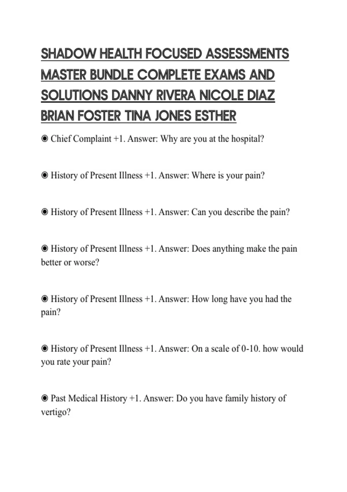 SHADOW HEALTH FOCUSED ASSESSMENTS MASTER BUNDLE COMPLETE EXAMS AND SOLUTIONS DANNY RIVERA NICOLE DIAZ BRIAN FOSTER TINA JONES ESTHER
