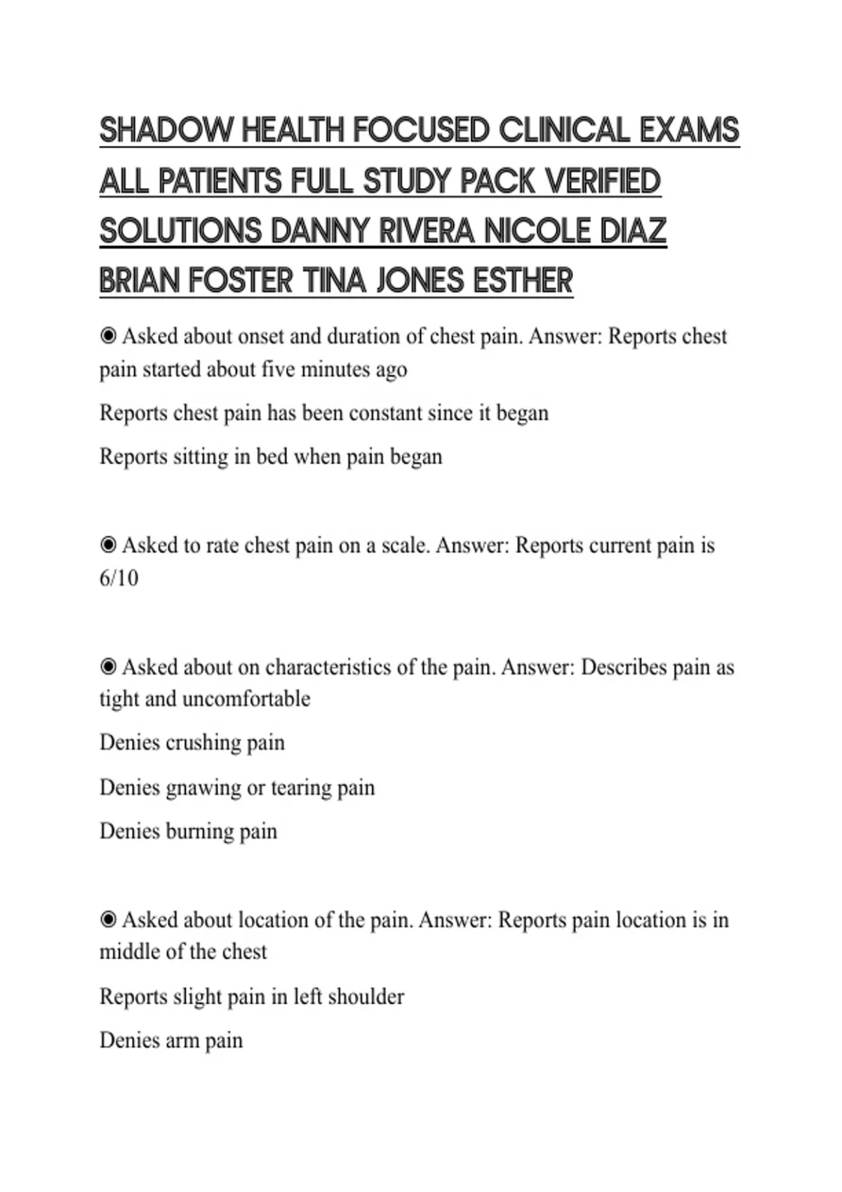 SHADOW HEALTH FOCUSED CLINICAL EXAMS ALL PATIENTS FULL STUDY PACK VERIFIED SOLUTIONS DANNY RIVERA NICOLE DIAZ BRIAN FOSTER TINA JONES ESTHER