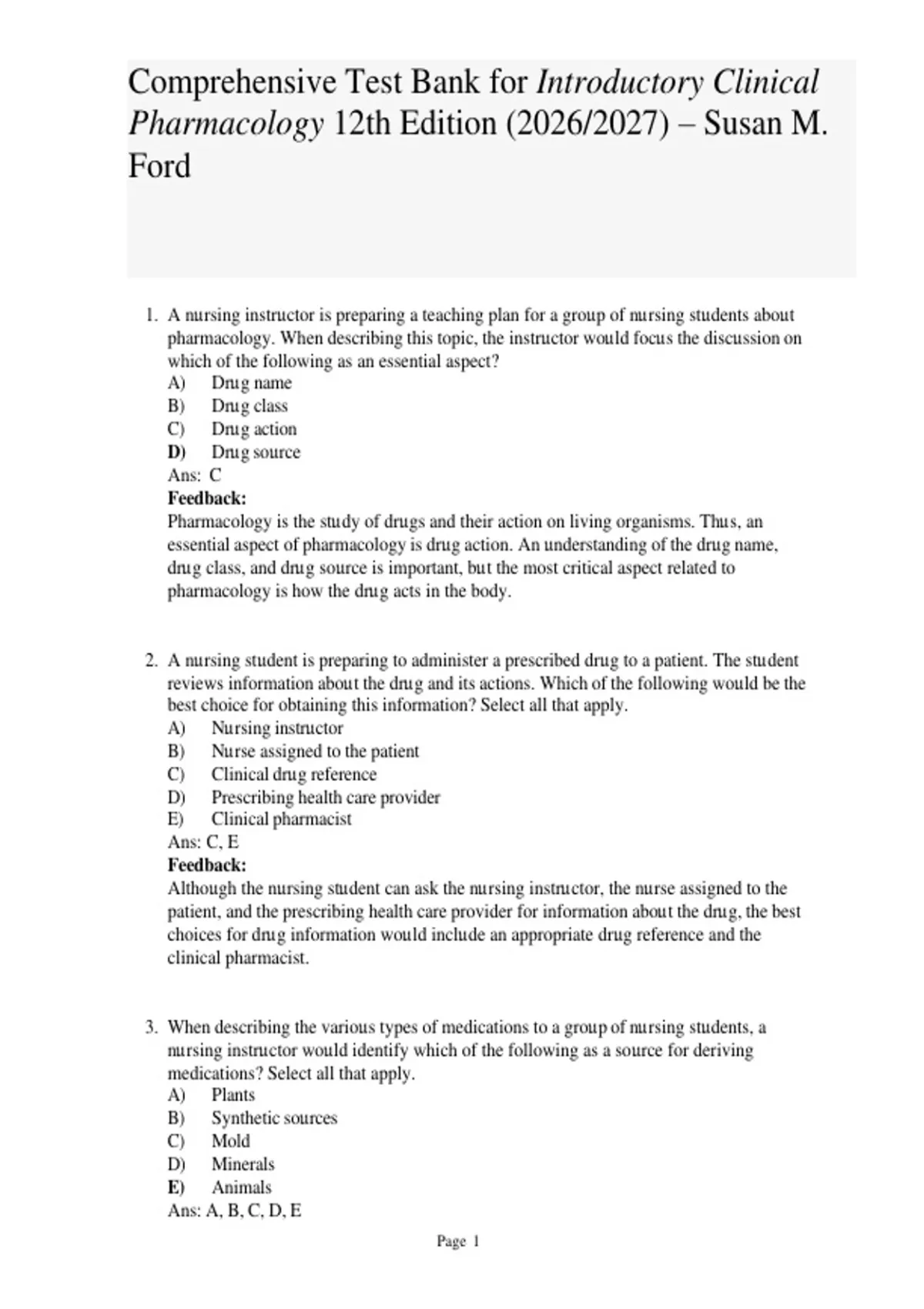 The Comprehensive Test Bank for Introductory Clinical Pharmacology, 12th Edition (2026/2027) by Susan M. Ford provides a full set of chapter-by-chapter exam questions with verified answers and detailed rationales designed for nursing and health sciences education. Fully aligned with the latest 12th Edition curriculum, this resource covers foundational pharmacology principles, medication administration and safety, pharmacokinetics and pharmacodynamics, Introductory Clinical Pharmacology test bank 12th editionmajor drug classes, clinical application, and NCLEX-style questions. Updated to reflect current pharmacologic content and practice standards, it enhances critical thinking, prepares students for academic exams, and supports success in clinical coursework and licensure review.