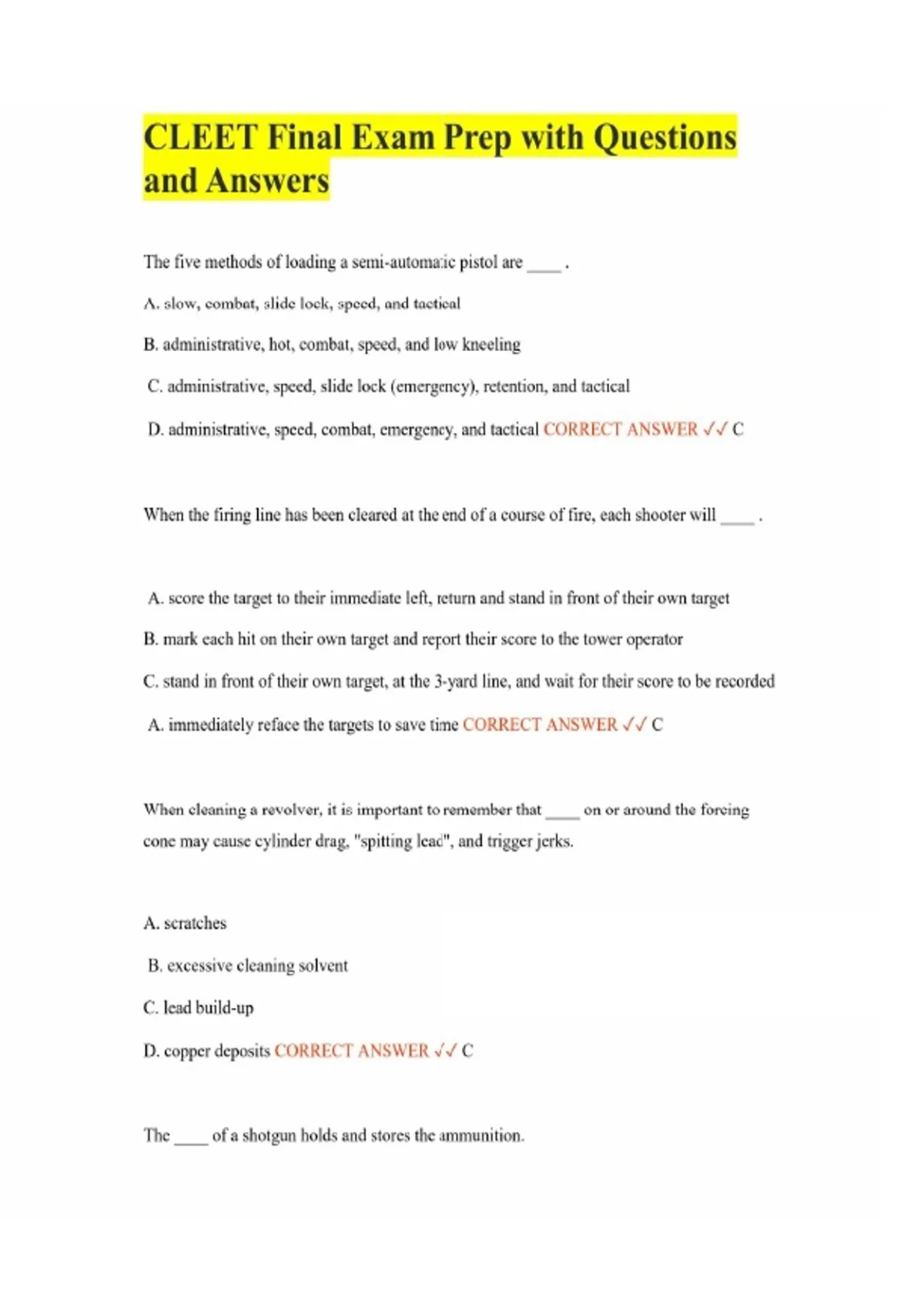 CLEET Final Exam Prep with Questions and Answers The five methods of loading a semi-automatic pistol are ____ . A. slow, combat, slide lock, speed, and tactical B. administrative, hot, combat, speed, and low kneeling C. administrative, speed, slide lock (emergency), retention, and tactical D. administrative, speed, combat, emergency, and tactical CORRECT ANSWER C When the firing line has been cleared at the end of a course of fire, each shooter will ____ . A. score the target to their immediate left, return and stand in front of their own target B. mark each hit on their own target and report their score to the tower operator C. stand in front of their own target, at the 3-yard line, and wait for their score to be recorded A. immediately reface the targets to save time CORRECT ANSWER C When cleaning a revolver, it is important to remember that ____ on or around the forcing cone may cause cylinder drag, "spitting lead", and trigger jerks. A. scratches B. excessive cleaning solvent C. lead build-up D. copper deposits CORRECT ANSWER C The ____ of a shotgun holds and stores the ammunition.